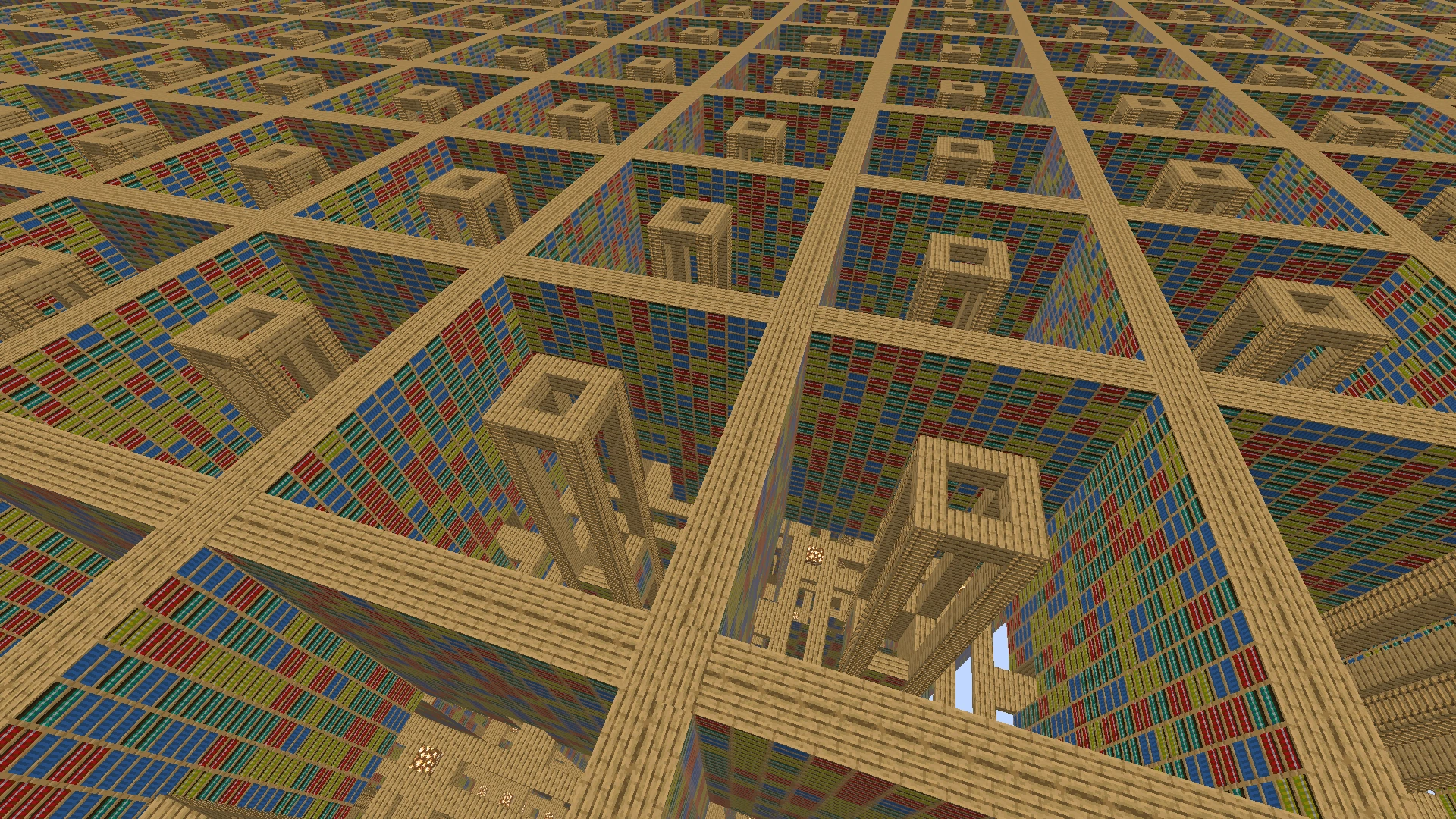 - "patterns" (307219718) "Muster" – Eine Dimension mit einem Raster aus 7x7x256 großen Säulen aus weißem und schwarzen Beton, die verschiedene Muster haben. Jede Zelle ist eine Binäre Zahl und wird pro Säule um eine Zahl höher. Dadurch unterscheiden sich die Zellen nur um einen Block zur vorherigen. Nach 134086656 Blöcken, also die 16760832. Zelle, erreicht man die höchste Zahl, die mit diesem System angezeigt werden kann.