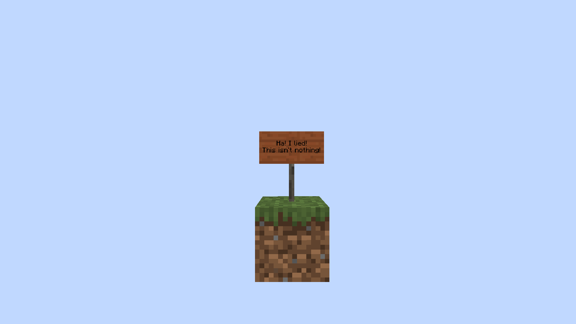 502640, 99, 1482450ein Grasblock, auf dem sich ein Akazienholzschild mit der Aufschrift "Ha! I lied! This isn't nothing!" (dt. "Ha! Ich habe gelogen! Das hier ist nicht Nichts!").- Die Chunkkoordinaten sind