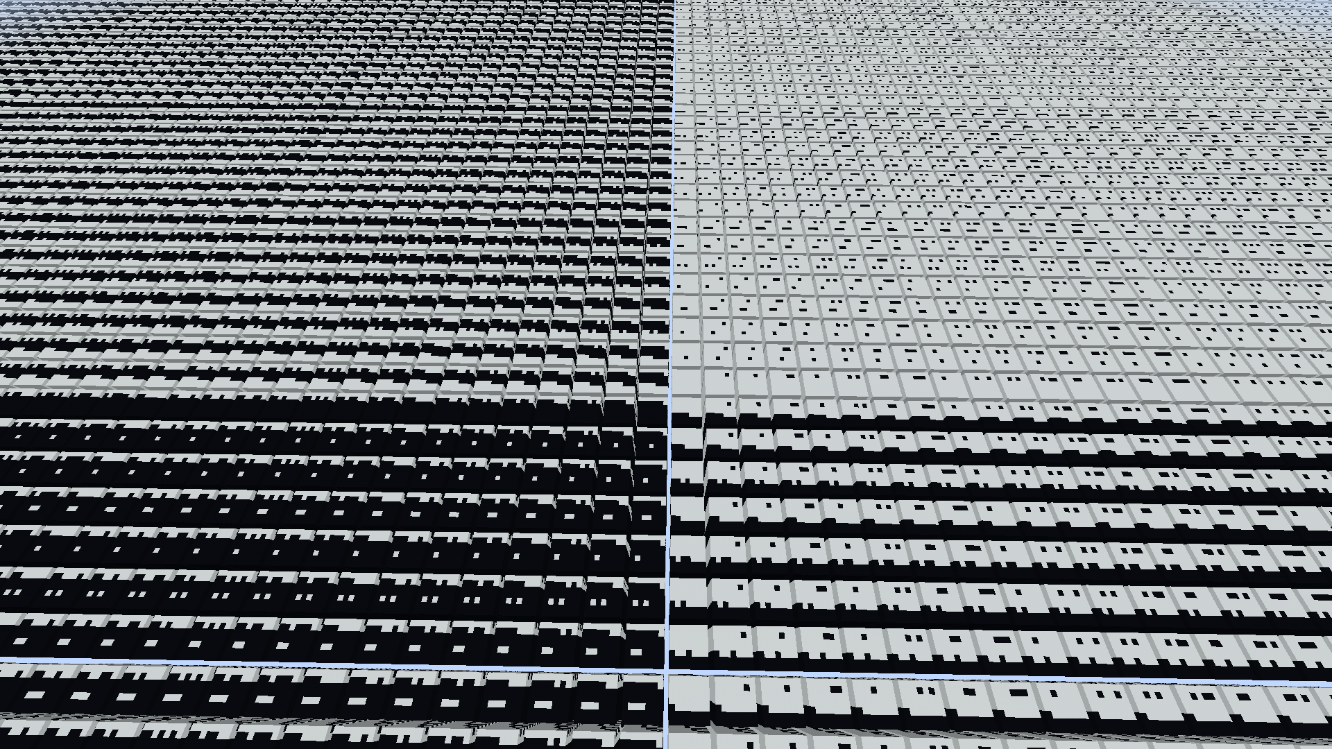 - "patterns" (307219718) "Muster" – Eine Dimension mit einem Raster aus 7x7x256 großen Säulen aus weißem und schwarzen Beton, die verschiedene Muster haben. Jede Zelle ist eine Binäre Zahl und wird pro Säule um eine Zahl höher. Dadurch unterscheiden sich die Zellen nur um einen Block zur vorherigen. Nach 134086656 Blöcken, also die 16760832. Zelle, erreicht man die höchste Zahl, die mit diesem System angezeigt werden kann.