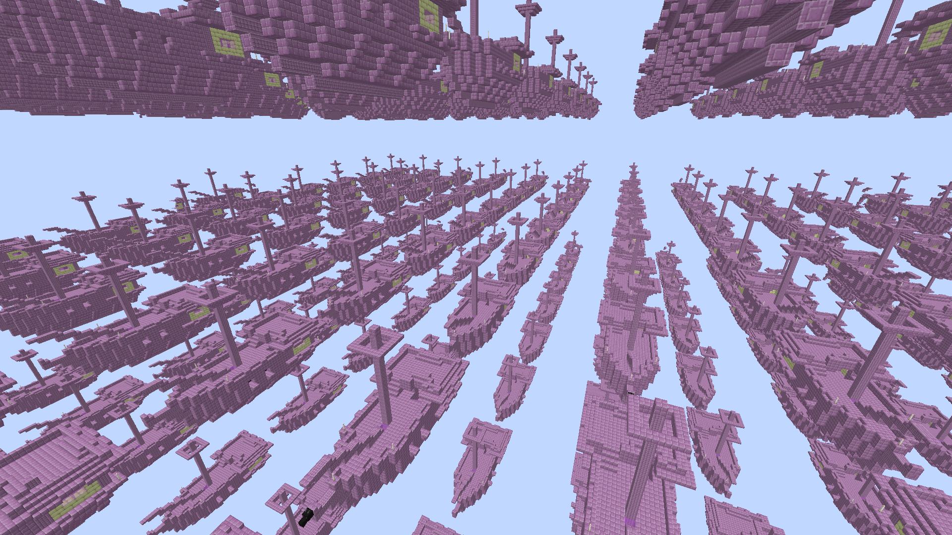 - "fleet" (1143264807) "Flotte" – Eine riesige Flotte von Endschiffen, welche sich auf drei Ebenen befinden (y=58, y=108 und y=158) und in einem Gittermuster angeordnet sind und sich im