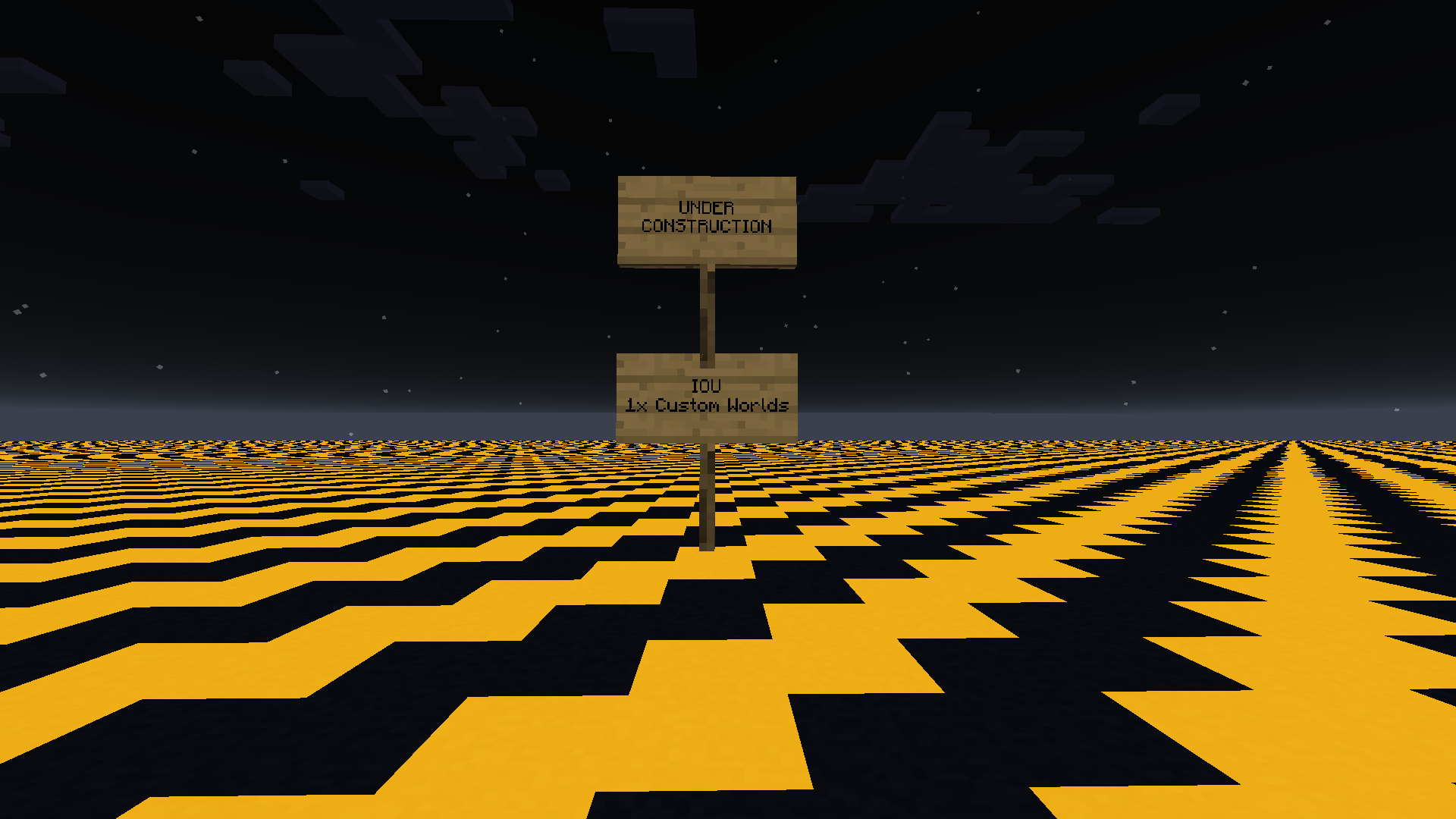 0, 18, 0befindet, auf welchem "UNDER CONSTRUCTION" (dt. "im Bau") steht und ein Zweites, welches sich einen Block höher befindet und auf dem "IOU 1x Custom Worlds" (dt. "IOU 1x Benutzerdefinierte Welt") steht. Dies ist eventuell eine Referenz zu einer neueren Entwicklungsversion für 1.16 20w21a, welche benutzderdefinierte Welten hinzufügte.