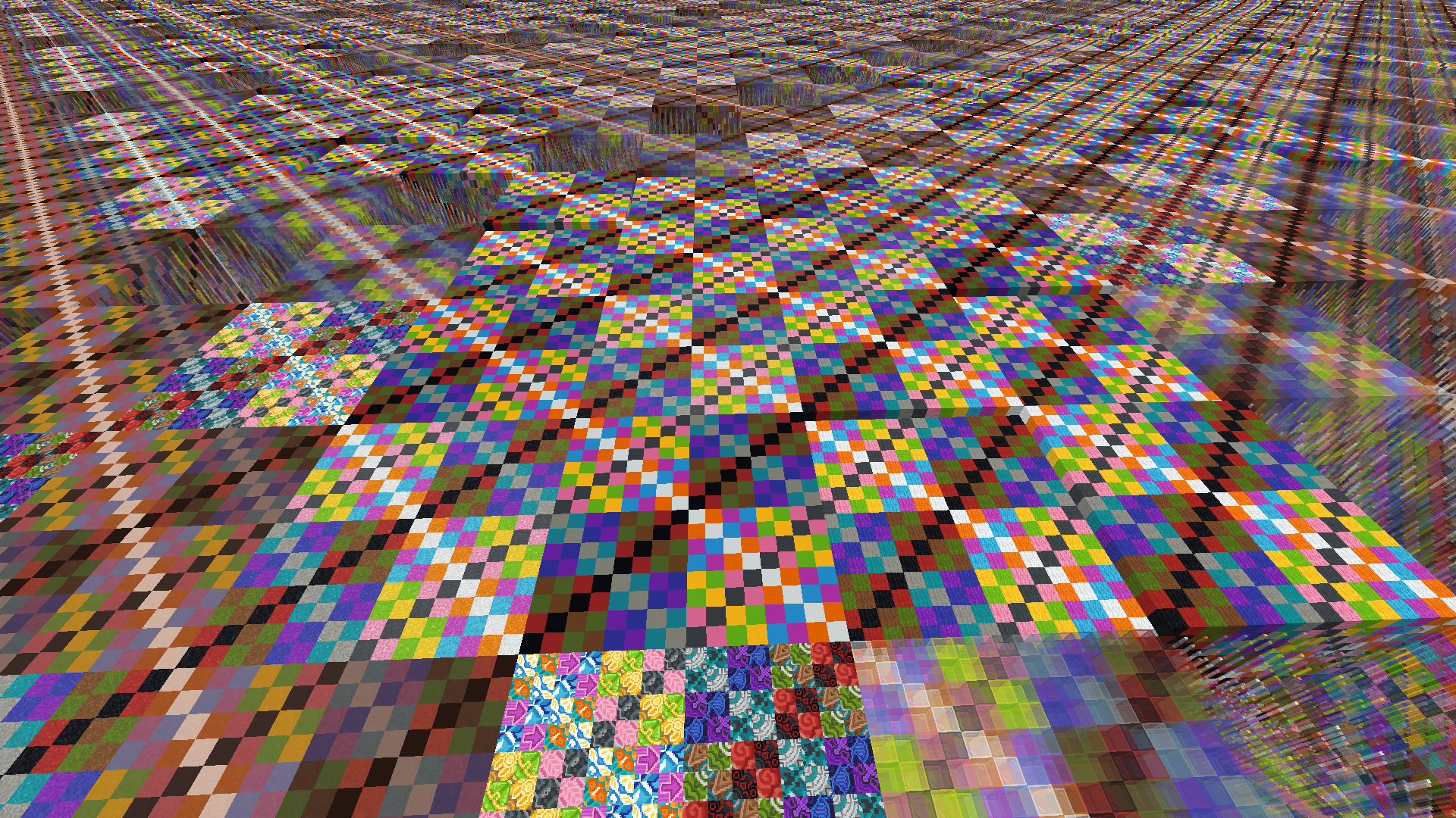 - "checkerboard" (1929426645) "Schachbrett" – Eine Dimension, bestehend aus allen färbbaren Blöcken, außer Wolle und Teppichen: Beton, Gefärbtem Glas, Gefärbten Glasscheiben, Keramik, Teppichen, Trockenbeton und Wolle. Diese sind in 16x16x16 Würfeln angeordnet und befinden sich zwischen y=0 und y=127.