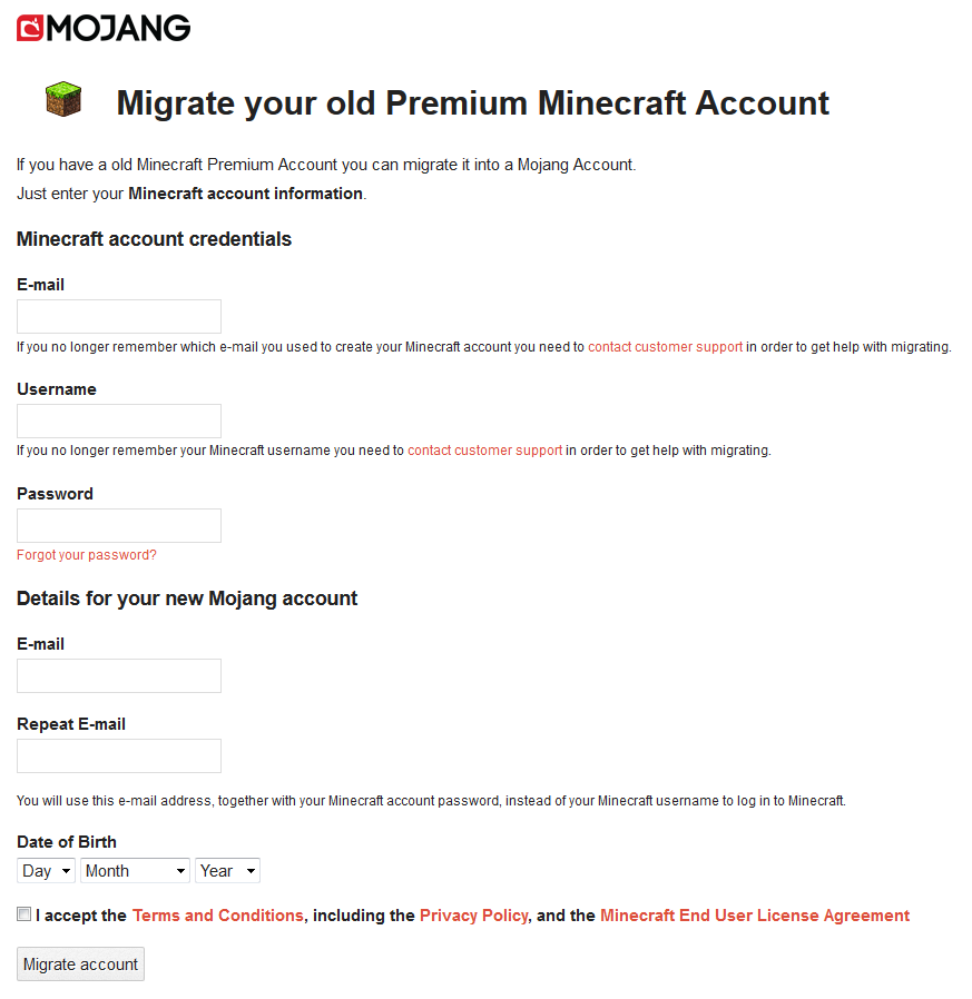 - Wenn man noch einen alten Minecraft-Account hat (Login mit Spielernamen), muss man diesen zuerst hier in einen Mojang-Account umwandeln.