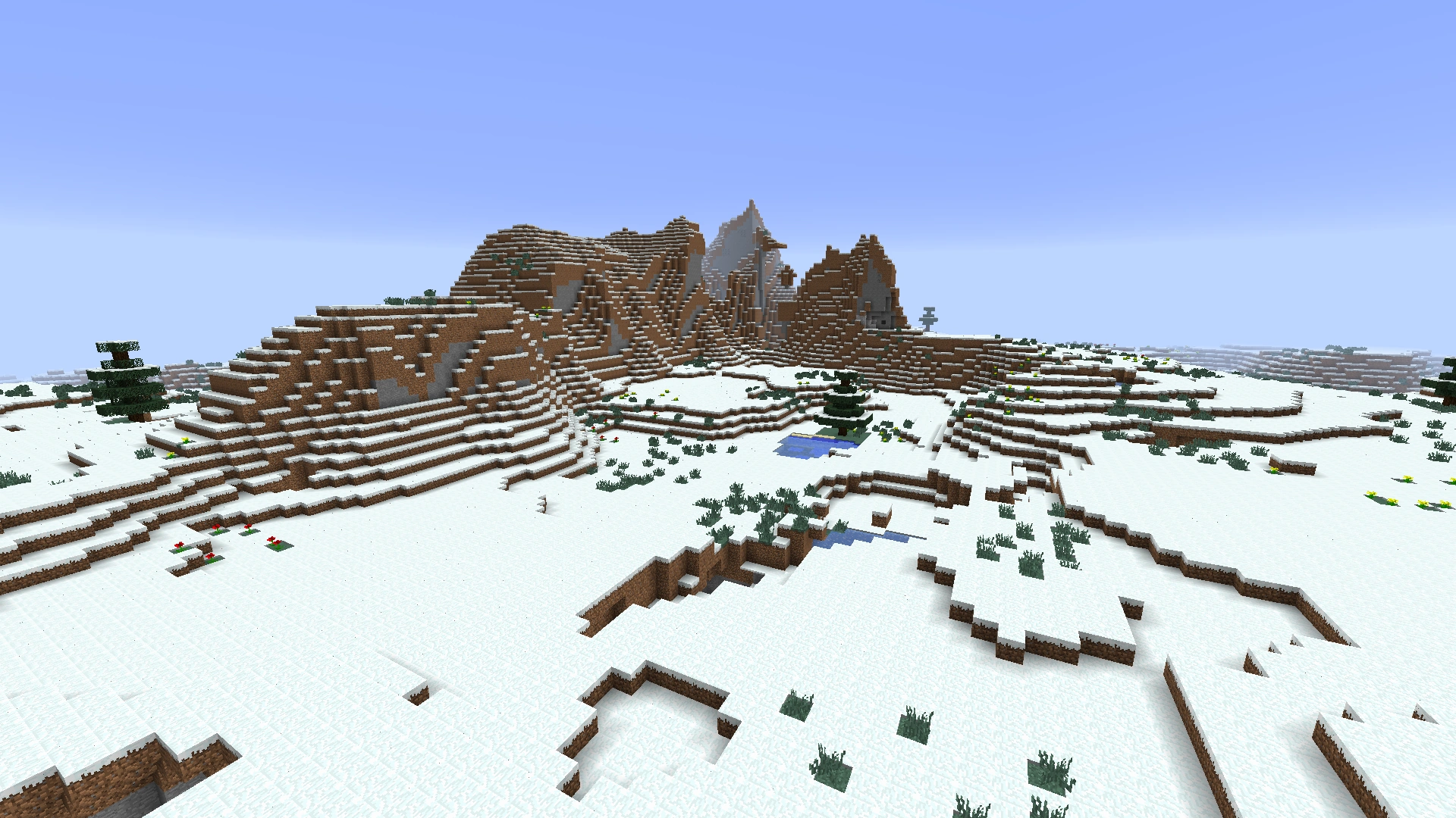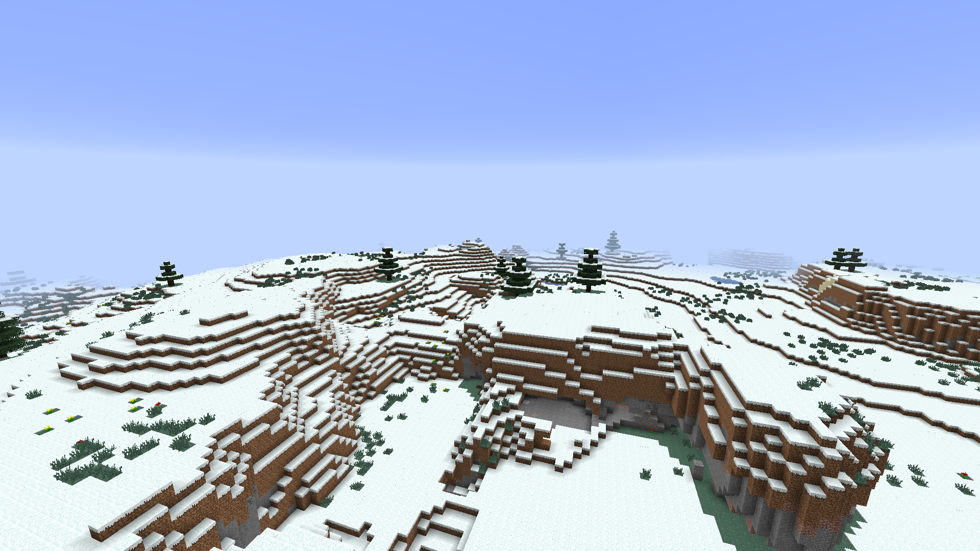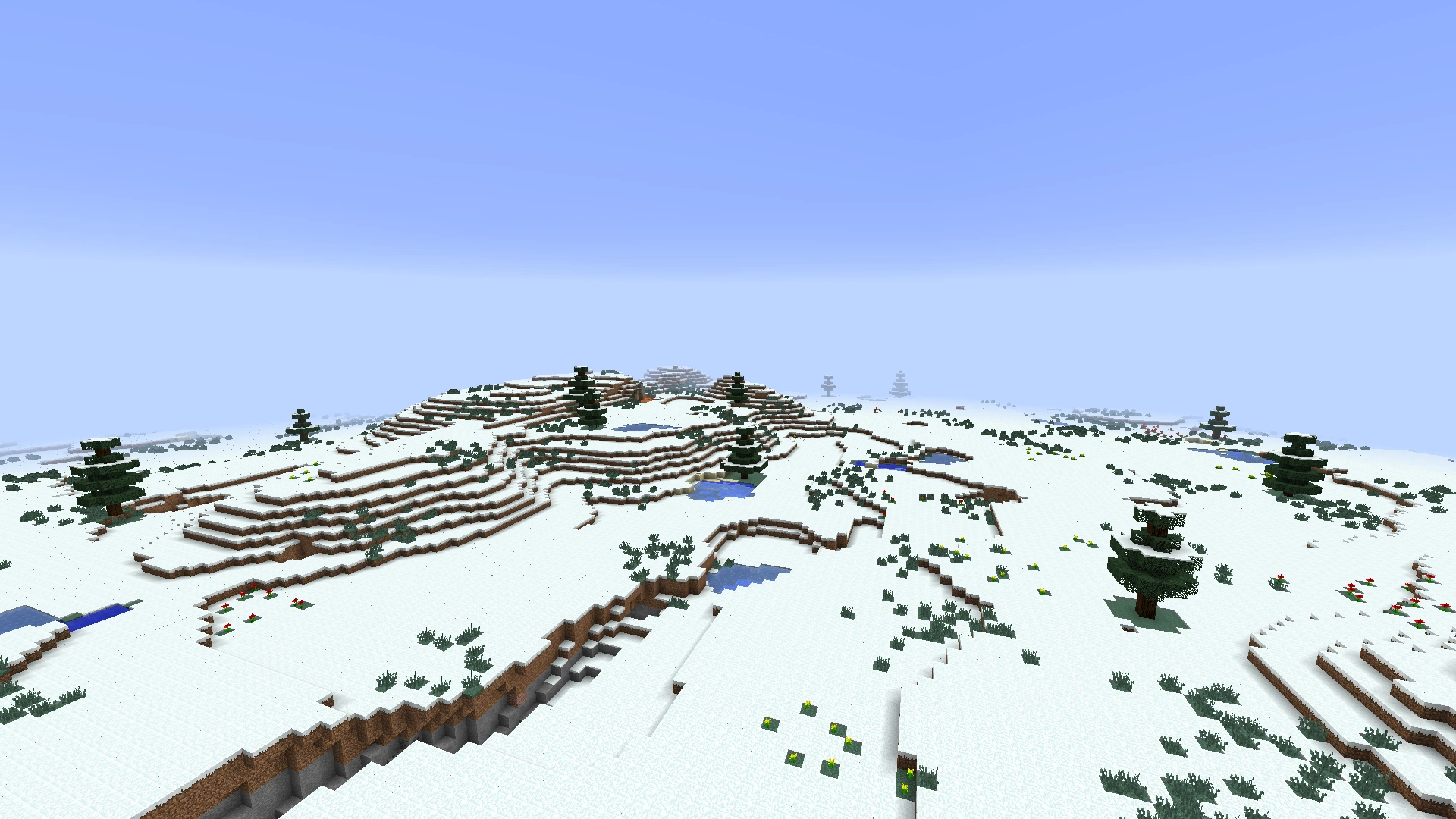 Test der Parameter: Es wurde immer derselbe Startwert "1234" verwendet. Der Spawnpunkt liegt in einer verschneiten Tundra (Ice Plains), ein Biom, das zu den Ebenen gehört und damit grundsätzlich eher flach ist und nur kleine Hügel hat. In der verschneiten Landschaft der Tundra sind die Höhenlinien auf den Screenshots besonders gut zu erkennen. Die Screenshots wurden immer von derselben X,Z-Position -79,-4 und meistens von der Höhe Y = 230 aus aufgenommen, in besonderen Fällen auch höher oder tiefer. Der Blick war immer nach Westen und senkrecht nach unten gerichtet.