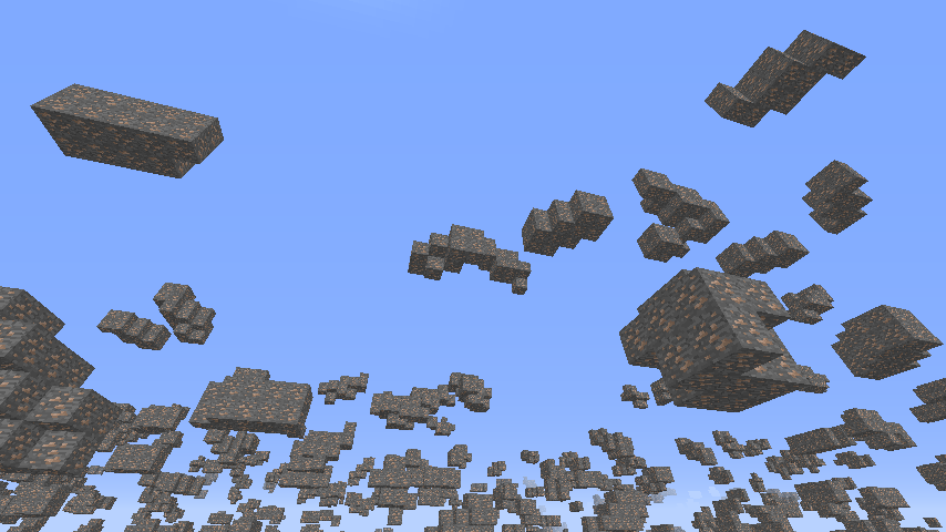 Für die Oberfläche verwendet der Minecraft-Weltgenerator viele Perlin-Noise-Funktionen. Alleine drei Perlin-Noise-Funktionen werden kombiniert, um die Standard-Hügellandschaft zu bilden (sie werden später noch durch biomspezifische Anpassungen weiter verändert): eine Hauptrauschfunktion, eine untere Begrenzung und eine obere Begrenzung. Der Weltgenerator berechnet für jede Koordinate (X,Z) den Mittelwert zwischen unterer und oberer Begrenzung mit dem Wert der Hauptrauschfunktion als Interpolationsfaktor[1]. Das Ergebnis kann man sich wie bei einem Waffeleisen vorstellen: in den Boden wird die Hügellandschaft der unteren Begrenzung gelegt, in den Deckel die Hügellandschaft der oberen Begrenzung. Dann wird die Hügellandschaft der Hauptrauschfunktion dazwischen gelegt und der Deckel geschlossen. Untere und obere Begrenzung prägen sich in die Hügellandschaft der Hauptrauschfunktion und verformen sie.