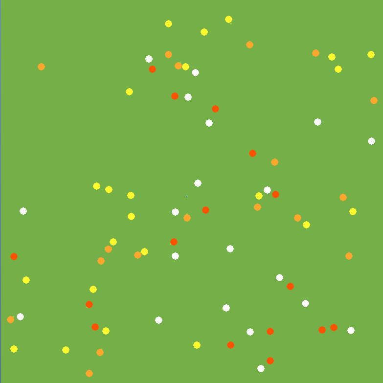 Test des Parameters: Der Startwert der Testwelten lautete immer "test". Es wurden fünf Varianten generiert: mit 1%, 25%, 50%, 75% und 100% Verliesen. Jede Variante wurde ohne Minen generiert, damit die Welten nur die Spawner und Truhen der Verliese enthalten. Außerdem wurde stets das Biom "Ebene" (Plains) eingestellt, damit die Oberfläche durchgehend grün ist. Schließlich wurden alle fortgeschrittenen Einstellungen (Seite 3) außer den Biom-Einstellungen auf den Minimalwert gesetzt, damit ein Flachland bis zur Höhe 256 entsteht. Damit haben die Welten einen maximal gefüllten Untergrund. Die fünf Welten wurden gestartet, ohne dass der Spieler sich bewegt hat. Dadurch ist jede Welt genau 25×25 Chunks groß mit dem Spieler im Zentrum. Danach wurden die fünf Welten mit MCEdit im Chunk-Modus angeschaut. Die Blockobjektdaten wurden sichtbar gemacht, wodurch man die Spawner und Truhen aus der Luft sehen konnte. Jede Dreiergruppe (manchmal auch nur Zweiergruppe) von Tile Entities steht für ein Verlies. Es wurden fünf Screenshots erzeugt und übereinander gelegt.