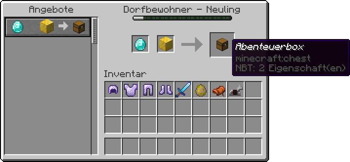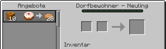 Sonst hat der Dorfbewohner keine Angebote, da der grüne "Nichtsnutz" sonst nicht handelt. Würde man stattdessen zum Beispiel einen Bibliothekar (Profession:1) erschaffen, würde man (nachdem man das letzte Angebot behandelt hat!) seine ganz normalen Angebote präsentiert bekommen, angefangen bei dem normalerweise ersten. Siehe Kreaturdaten#Dorfbewohner. |