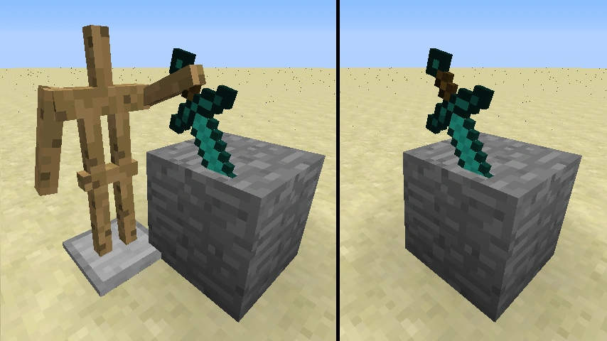 Nun stellt man einen Stein unter das Schwert. Es scheint nun darin zu stecken. Als letztes wird der Rüstungsständer unsichtbar und unzerstörbar gemacht: /data merge entity @e[type=armor_stand,limit=1,distance=..5] {Invisible:true, Marker:true}