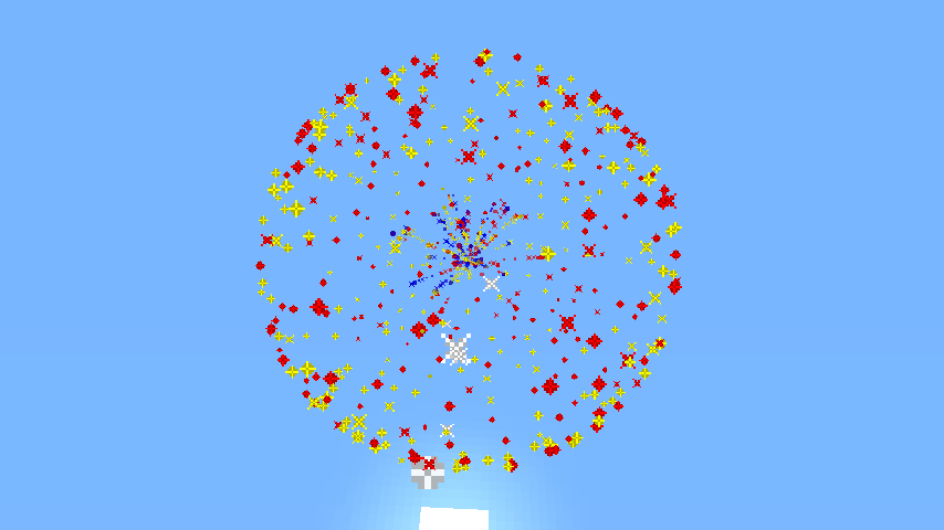 Das Feuerwerk explodiert nach 20 Ticks (LifeTime:20). Die zum Feuerwerk gehörende Feuerwerksrakete (id:"minecraft:firework_rocket") speichert ihre Effektdaten in der tag-Eigenschaft. Diese enthält die Fireworks-Eigenschaft, die die Explosions-Eigenschaft enthält. Hier zeigt sich schön die Baumstruktur des NBT-Formates. Die Explosions-Eigenschaft ist eine Aufzählung von Explosionen. Hier im Beispiel sind es zwei: die erste ist eine Explosion (Type:4) mit Flackern (Flicker:true) und Schweif (Trail:true). Die Hauptfarben und die abklingenden Farben sind Aufzählungen. Hier sind es drei Farben (die Formel für eine Farbe setzt sich aus den RGB-Werten zusammen (Rot/Grün/Blau-Anteile) und lautet: 65536 × R + 256 × G + B). Bei der ersten Explosion sind Hauptfarben und die abklingenden Farben identisch. Die zweite Explosion ist ein großer Ball (Type:1) ohne Flackern und ohne Schweif (Flicker:false,Trail:false). Siehe Objektdaten. |