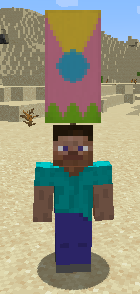 Dem nächstgelegenen Spieler (@p) wird in den Rüstungs-Slot des Helmes (armor.head) ein Rosa Banner (ID minecraft:pink_banner) mit drei Mustern gesetzt: Dreieck oben (tt) in gelb (4), Sägezahn unten (bts) in hellgrün (5) und Punkt in der Mitte (mc) in hellblau (3). Siehe Gegenstandsdaten und Blockobjektdaten. |