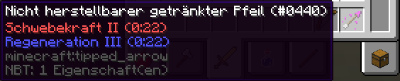 Dem nächstgelegenen Spieler (@p) wird ein Effektpfeil gegeben (ID minecraft:tipped_arrow, Anzahl 1). Der Pfeil hat zwei Effekte (CustomPotionEffects:), nämlich Schwebekraft II (Id:25b, Amplifier:1b) und Regeneration III (Id:10b, Amplifier:2b). Beide Effekte wirken 22 Sekunden (Duration:3600). Der Effektpfeil, den man durch einen Befehl bekommt, hat eine rosa Färbung, unabhängig von den Effekten, die auf dem Pfeil sind. Die Farbe der aufsteigenden Partikel ist eine Mischung der Trankfarben der Effekte. Die Farbe des Pfeils und der Partikel kann man mit "CustomPotionColor:Zahl" verändern. Die Zahl ergibt ist aus den jeweiligen RGB-Bestandteilen der erwünschten Farbe, aus der Formel 65536*R+256*G+B. Siehe Gegenstandsdaten#Trank, Wurftrank, Verweiltrank und getränkter Pfeil. |