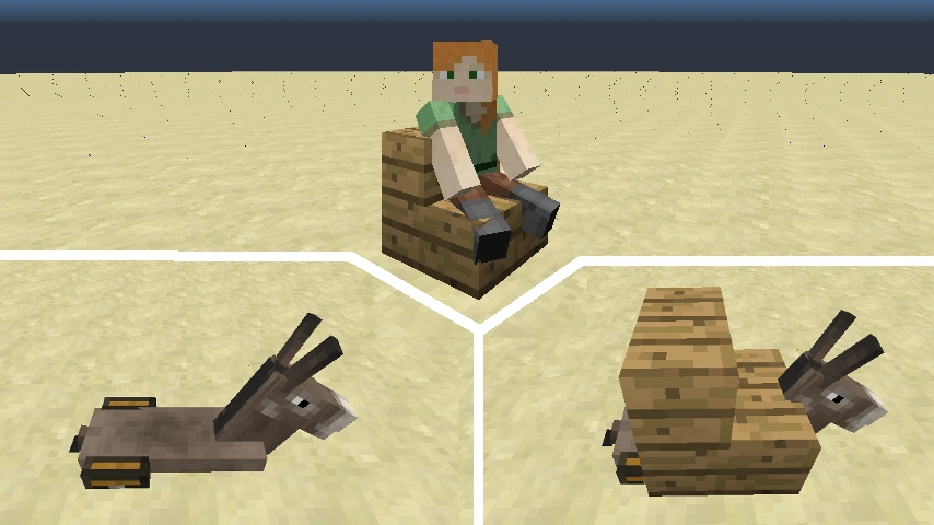 Einen Sessel, den man benutzen kann, erstellt man, indem man in einer Treppe einen Esel erzeugt, der unverwundbar und unsichtbar ist. Er wird wie ein normaler Esel benutzt: Aufsteigen mit Rechtsklick, Absteigen mit der Schleichen-Taste. Die Truhe wird im Stehen mit Schleichen-Taste und Rechtsklick geöffnet, im Sitzen indem man das eigene Inventar öffnet. Mit dem Befehl Direkt unter dem Sessel wird ein Befehlsblock platziert, der folgenden Befehl enthält: