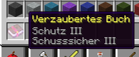 Dem nächstgelegenen Spieler (@p) wird ein verzaubertes Buch gegeben (ID minecraft:enchanted_book, Anzahl 1) mit zwei Verzauberungen: Schutz III (id:"minecraft:protection", lvl:3s) und Schusssicher III (id:"minecraft:projectile_protection", lvl:3s). Siehe Gegenstandsdaten. |