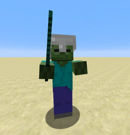 Ein Zombie erscheint einen Block über der Befehlsquelle. Er ist mit einem Diamantschwert (id:"minecraft:diamond_sword") und einem Eisenhelm (id:"minecraft:iron_helmet") ausgerüstet. Die anderen Ausrüstungsgegenstände - Fuß, Bein und Brust - sind leer. Außerdem wird angegeben, dass das Schwert immer (1.0f = 100%) und der Helm manchmal (0.1f = 10%) vom Zombie beim Tod gedroppt wird. Dazu muss die Spielregel doMobLoot angeschaltet sein. Damit überhaupt etwas droppen kann, muss außerdem die Anzahl der Gegenstände mit 1 angegeben sein (Count:1b). Dass die Gegenstände nur eine geringe Haltbarkeit haben, lässt sich nicht verhindern (Das Setzen der Damage- oder Unbreakable-Eigenschaft wird ignoriert). Siehe Kreaturdaten. |