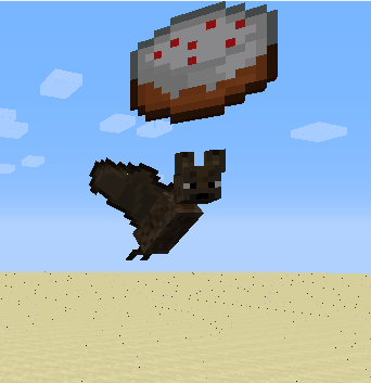 Einen Block über der Befehlsquelle wird eine Fledermaus erzeugt, die den Statuseffekt Unsichtbarkeit hat (Id:14). Die Dauer des Statuseffekts beträgt über 2.000.000.000 Ticks = ca. 3 Jahre Spieldauer, danach wird sie sichtbar. Solange wird die Fledermaus aber nicht im Spiel sein, denn sie verschwindet, wenn man sich zu weit von ihr entfernt. Sie hat einen Gegenstand als Passagier (id:"minecraft:item"), der aus einem Kuchen besteht (id:"minecraft:cake"). Nach 5 Minuten verschwindet der Gegenstand, außer man gibt ihm die Eigenschaft Age:-32768. Da der fliegende Gegenstand aber eher als kurzzeitiger Überraschungseffekt geeignet ist, ist das nicht nötig. Wenn man nahe genug herankommt, wird der Gegenstand ins eigene Inventar aufgenommen. Siehe Objektdaten und Kreaturdaten. |