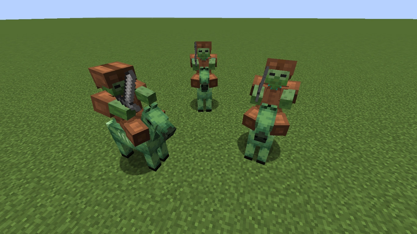 Ein Pferd erscheint einen Block über der Befehlsquelle. Es ist ein Zombiepferd, das zahm sein muss (Tame:true), sonst wird der Passagier abgeworfen. Dieser besteht aus einem Zombie mit Steinschwert (id:"minecraft:stone_sword") und Lederrüstung (ArmorItems:), deren Helm ihn vor der Sonne schützt. Siehe Kreaturdaten.