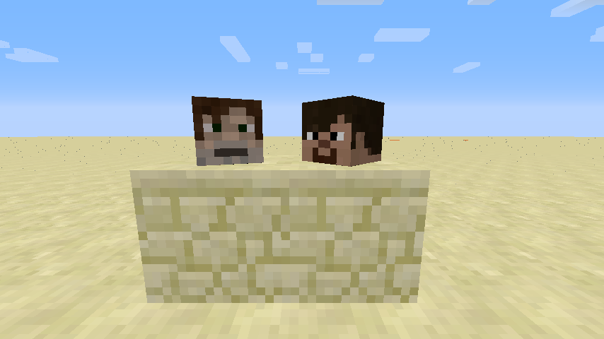 An der eigenen Position wird ein Kopf (ID minecraft:player_head) gesetzt. Er hat den Blockzustand "Ausrichtung" (rotation) mit dem Wert "Westen" (4), d. h. um sein Gesicht zu sehen, muss man nach Westen schauen. Der Kopf von jedem registrierten Minecraft-Spieler kann so platziert werden. Im Beispiel ist es der fiktive Spieler oyo123 (ExtraType:oyo123). Siehe Blockobjektdaten. |