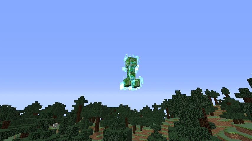 Ein Creeper erscheint einen Block über der Befehlsquelle. Er trägt eine Elekro-Aura, als ob er vom Blitz getroffen wurde. Der Explosionsradius beträgt 300 Blöcke (normal sind 3). Wenn der Creeper explodiert, erzeugt das einen Krater von ca. 30 Blöcken Durchmesser sowie einzelne Schäden im weiteren Umkreis. Das Besondere ist: er reitet auf einer Fledermaus (ID minecraft:bat). Sie ist unsichtbar, weil auf ihr der entsprechende Statuseffekt (Id:14) liegt, mit Verstärkung 0 (Amplifier:0), was aber bei Unsichtbarkeit keine Auswirkung hat, keiner Darstellung von Partikeln (ShowParticles:false) und einer Dauer von über 2.000.000.000 Ticks = ca. 3 Jahre Spieldauer, danach wird es sichtbar. Siehe Kreaturdaten. Da die Fledermaus den Flug bestimmt, fliegt der Creeper ziellos und zufällig umher und ist kaum zu treffen. |