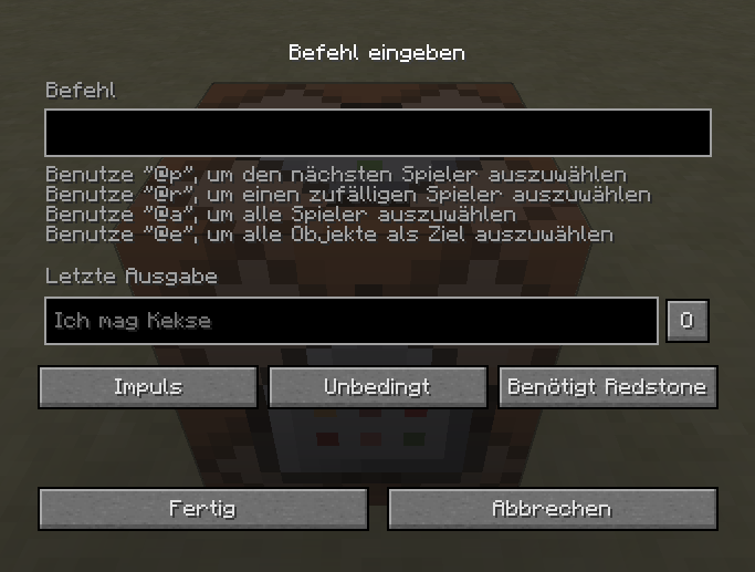 Der Befehl Die Befehle darf der normale Spieler nicht ausführen, daher werden sie über den Befehl Der erste Befehl gibt dem Spieler einen Diamanten ins Inventar, der zweite gibt ihm den Statuseffekt der Direktheilung und der dritte schreibt eine Nachricht in den Chat. Siehe Blockobjektdaten. |