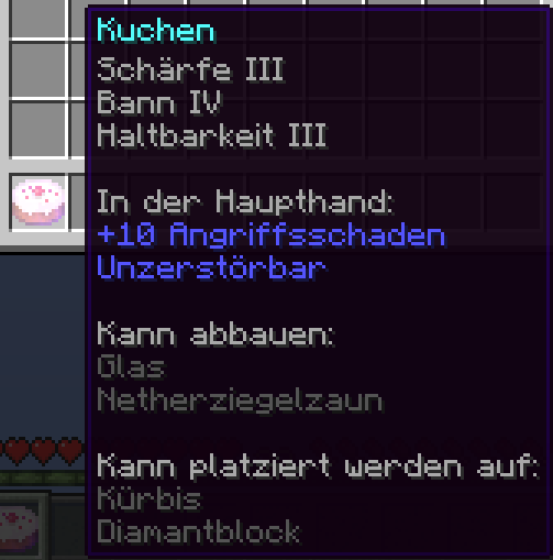 Dem nächstgelegenen Spieler (@p) wird ein Kuchen gegeben (ID minecraft:cake, Anzahl 1), der ewige Haltbarkeit hat (Unbreakable:true), im Abenteuermodus folgende Blöcke abbauen kann: Glas, Netherzaun (CanDestroy), im Abenteuermodus an einen Kürbis oder einen Diamantblock platziert werden kann (CanPlaceOn), drei Verzauberungen hat (Enchantments): Schärfe III (id:"minecraft:sharpness"), Bann IV (id:"minecraft:smite") und Haltbarkeit III (id:"minecraft:unbreaking"), die in dieser Reihenfolge im Inventar angezeigt werden und schließlich einen Angriffsschaden hat (AttributeName:"generic.attack_damage") von +10 (Amount:10.0d), der durch einen Attribut-Modifikator (AttributeModifiers-Liste mit einem Listenelement) hervorgerufen wird. Der Modifikator wirkt nicht prozentual, sondern absolut auf das Angriffsschaden-Attribut (Operation:0) und hat eine eindeutige ID, die sich aus den beiden Hälften mit den beliebig gewählten Zahlen 0, 0, 0 und 1 (UUID:[I;0,0,0,1]) zusammensetzt. Siehe Gegenstandsdaten und Attribute. |