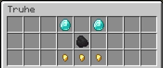 Dem nächstgelegenen Spieler (@p) wird eine Truhe (ID minecraft:chest, Anzahl 1) gegeben, die zwei Diamanten, eine Kohle und drei Goldklumpen in Form eines Gesichtes enthält. Der Spieler wird das erst bemerken, wenn er die Truhe platziert und öffnet. Siehe Gegenstandsdaten. |