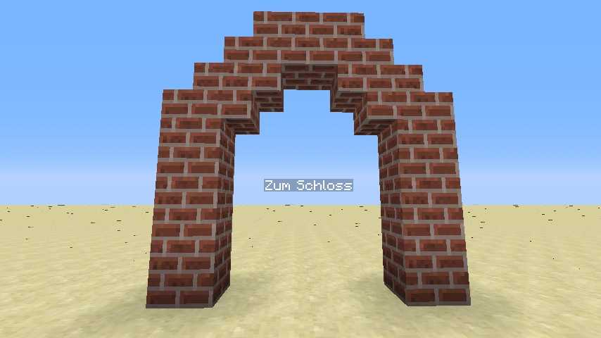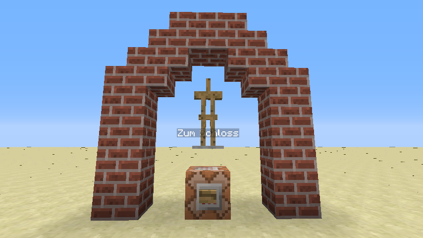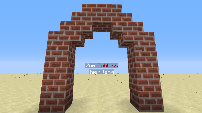Der Befehl erzeugt ein stehendes Schild (ID minecraft:oak_sign) auf dem Befehlsblock, das nur den Text "Klick" enthält. Das Schild ist auf der Textseite anklickbar (clickEvent:) und schreibt (/data merge block) einen neuen Befehl (Command:) in den Befehlsblock unter ihm. Der neue Befehl erzeugt einen Rüstungsständer (/summom minecraft:armor_stand) mit den oben genannten Eigenschaften. Der Name enthält zwei Paragrafenzeichen in Unicode-Form: §4 färbt den Text "Schloss" dunkelrot und §f färbt den Text danach wieder weiß. Wenn man das Schild anklickt, passiert scheinbar nichts. Schaut man aber danach in den Befehlsblock, sieht man dort bereits den fertig formatierten Text. Das Schild sollte man jetzt löschen. Aktiviert man danach den Befehlsblock, wird der formatierte Text erzeugt. Den Befehlsblock löscht man dann ebenfalls. Durch das Escaping wird der Befehl allerdings schwer lesbar. Mehrzeilige Texte sind auch mit Unicodes nicht möglich, aber man kann ganz einfach mehrere Rüstungsständer im Abstand von 0.3 Blöcken untereinander erzeugen, dann sehen ihre Beschriftungen wie ein mehrzeiliger Text aus. Siehe Objektdaten und Formatierungscodes. |