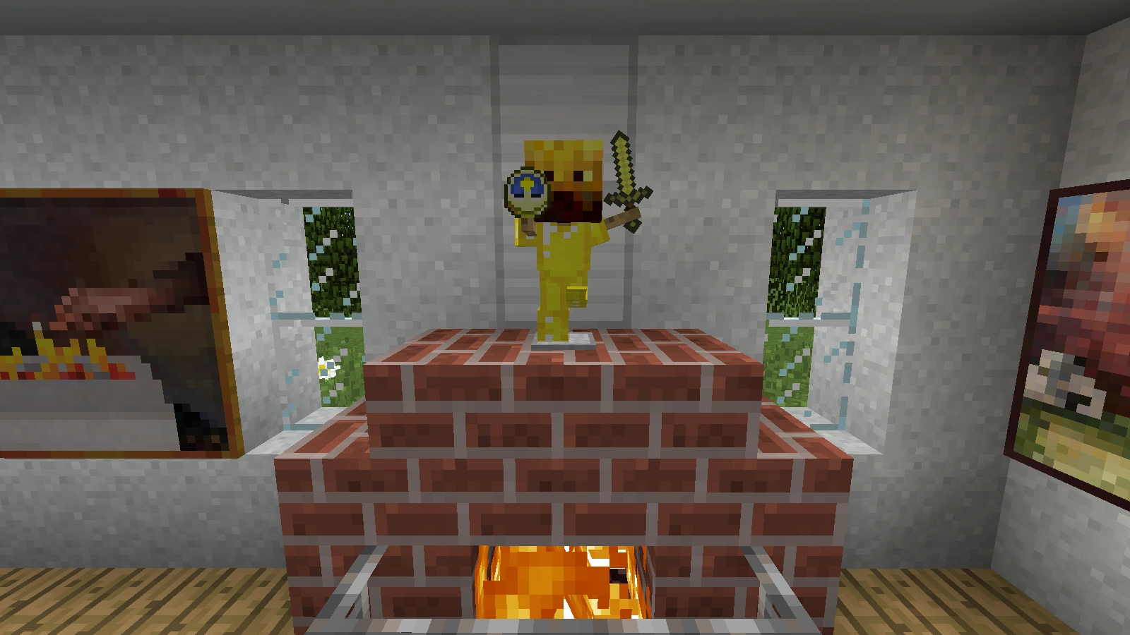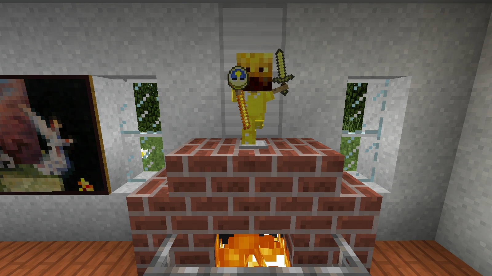 Diese Schwingpendeluhr besteht aus einem kleinen Rüstungsständer mit Bodenplatte und Armen, der eine komplette Goldrüstung mit Goldschwert in der linken Hand trägt. Auf dem Kopf trägt dieser den Kopf einer Lohe ("MHF_Blaze") und in seiner rechten Hand die eigentliche Uhr.