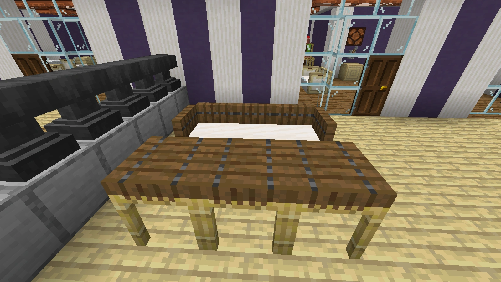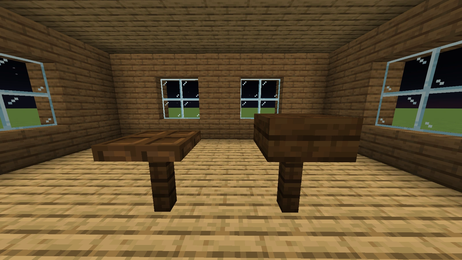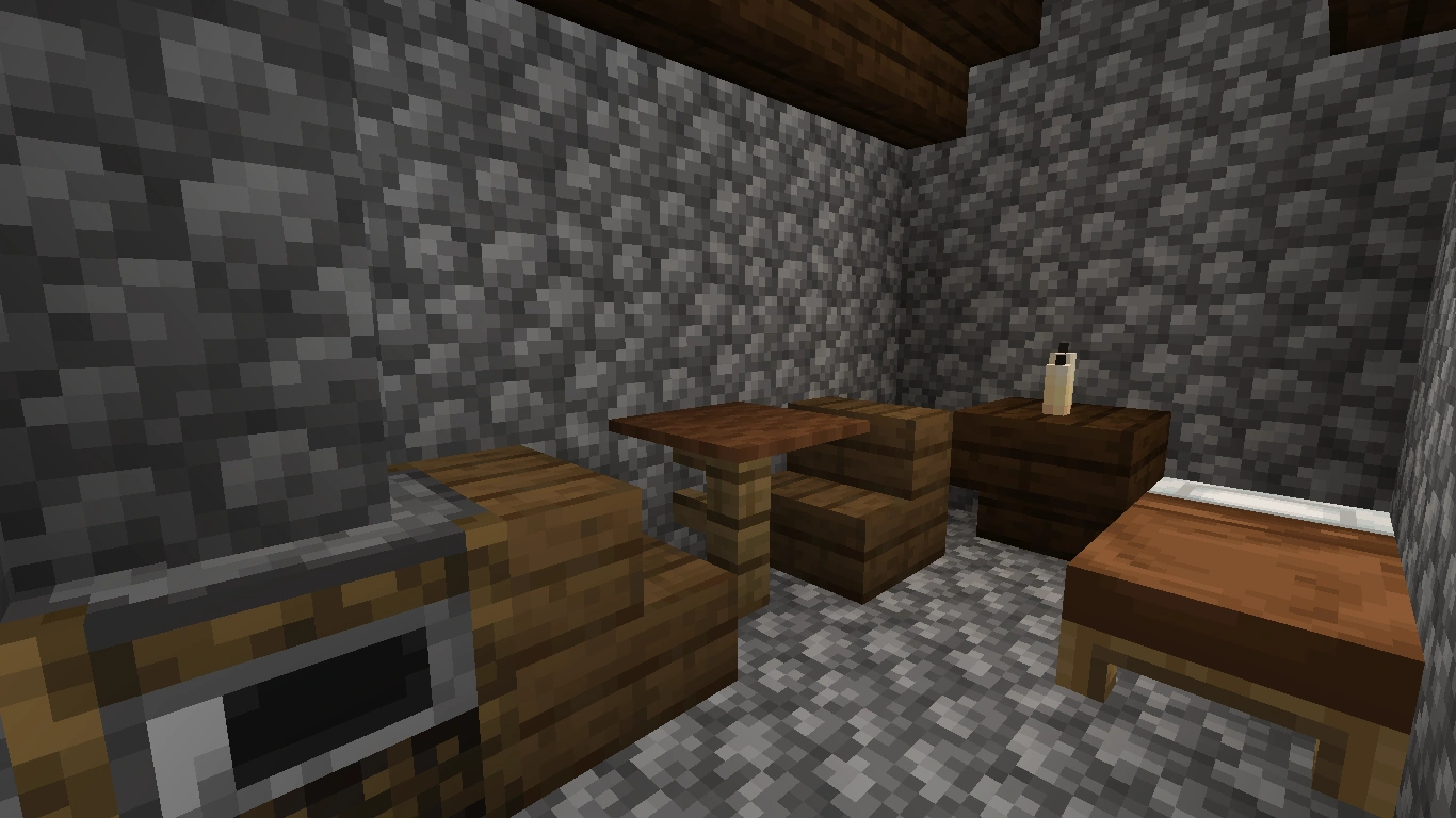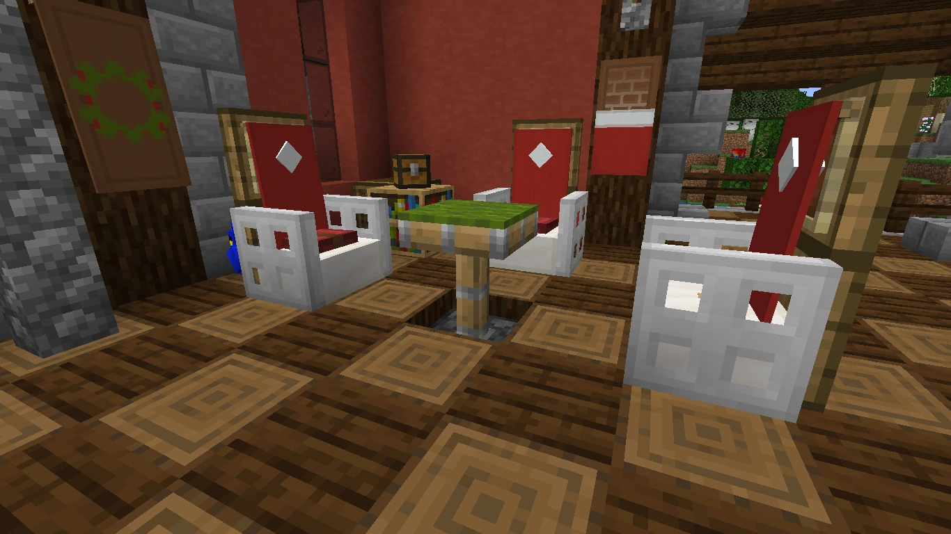 Bei diesen Arten von Tischen ist es ebenfalls möglich, fast jede Art von Tischbein zu verwenden. Eine Tischplatte aus Falltüren sieht dekorativ aus, aber sie hat im normalen Ressourcenpaket Löcher. Ein Tisch mit einer Stufe als Tischplatte ist 1,5 Blöcke hoch. Er eignet sich mehr als Bartisch, ist aber dennoch dekorativ. Allerdings lässt er sich, sofern man einen ganzen Block als Bein verwendet hat und die Stufen an die obere Hälfte dieses Blocks gesetzt hat, dekorieren.