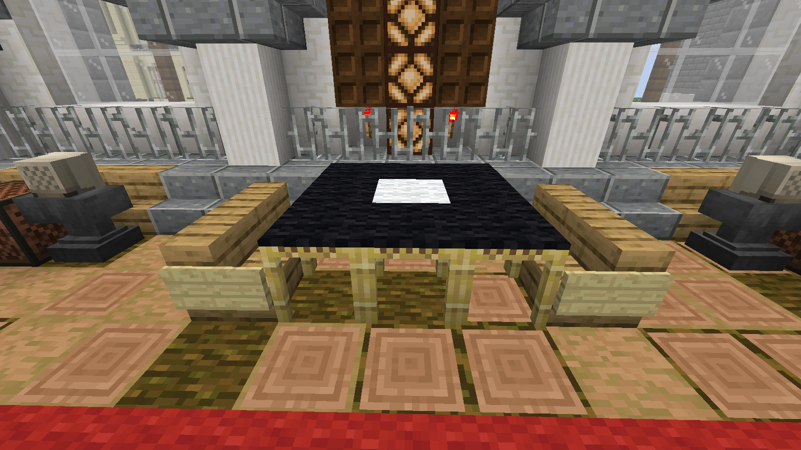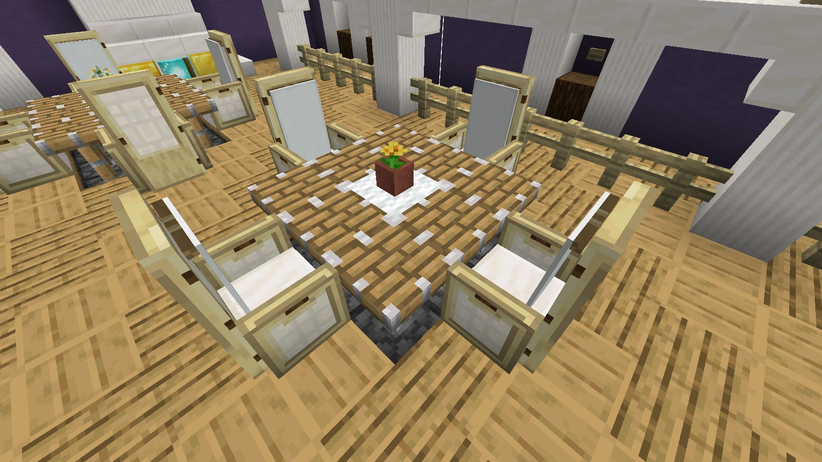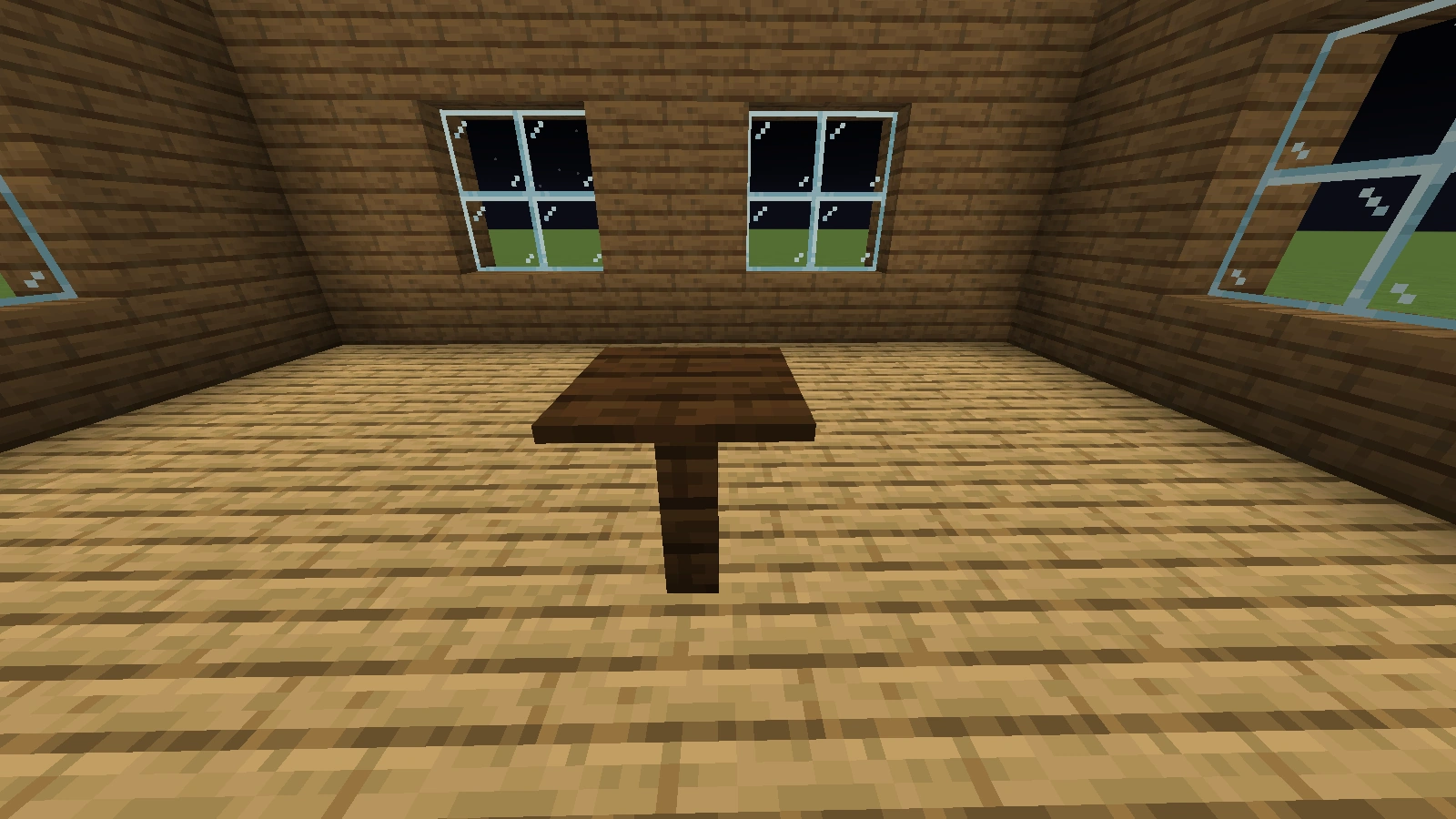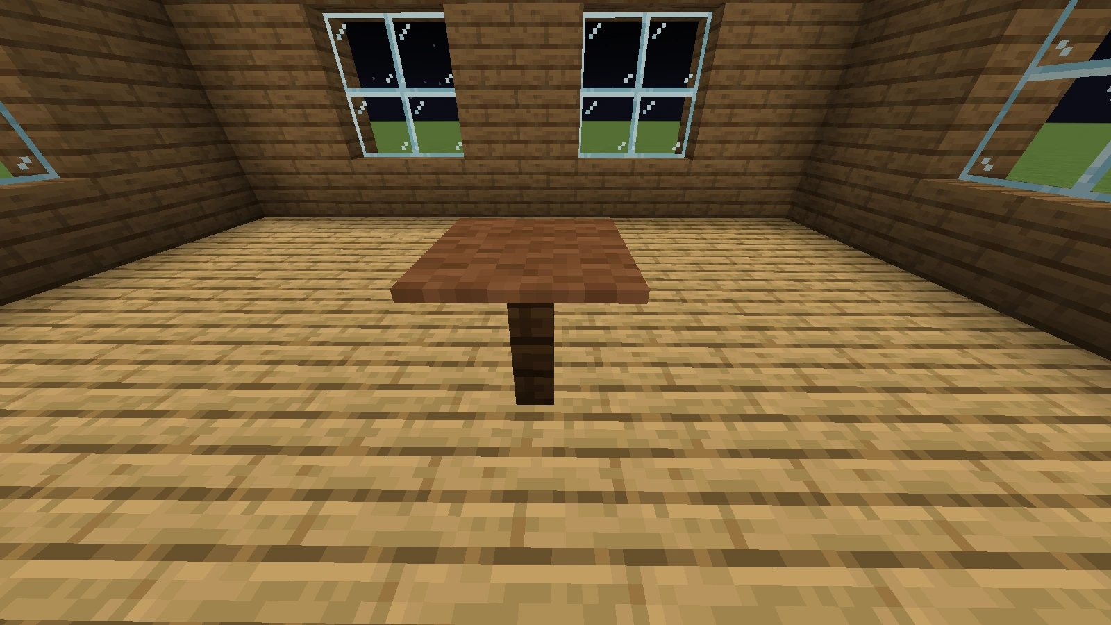 Bei diesen Arten von Tischen ist es ebenfalls möglich, fast jede Art von Tischbein zu verwenden. Eine Tischplatte aus Falltüren sieht dekorativ aus, aber sie hat im normalen Ressourcenpaket Löcher. Ein Tisch mit einer Stufe als Tischplatte ist 1,5 Blöcke hoch. Er eignet sich mehr als Bartisch, ist aber dennoch dekorativ. Allerdings lässt er sich, sofern man einen ganzen Block als Bein verwendet hat und die Stufen an die obere Hälfte dieses Blocks gesetzt hat, dekorieren.