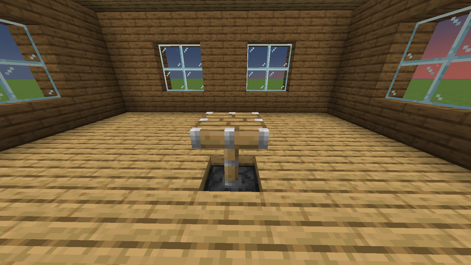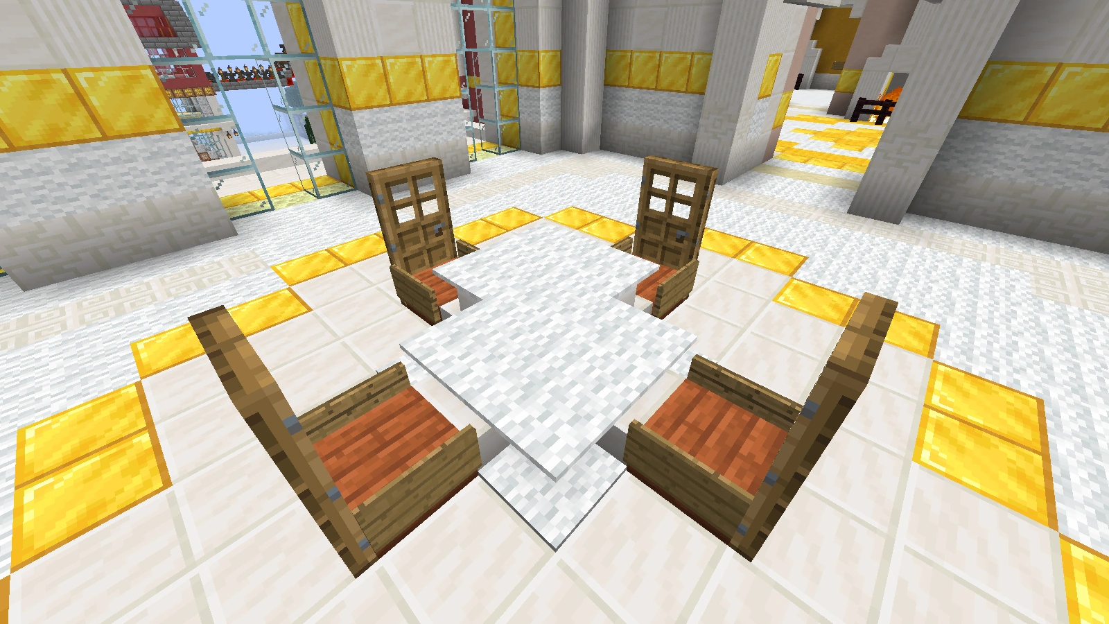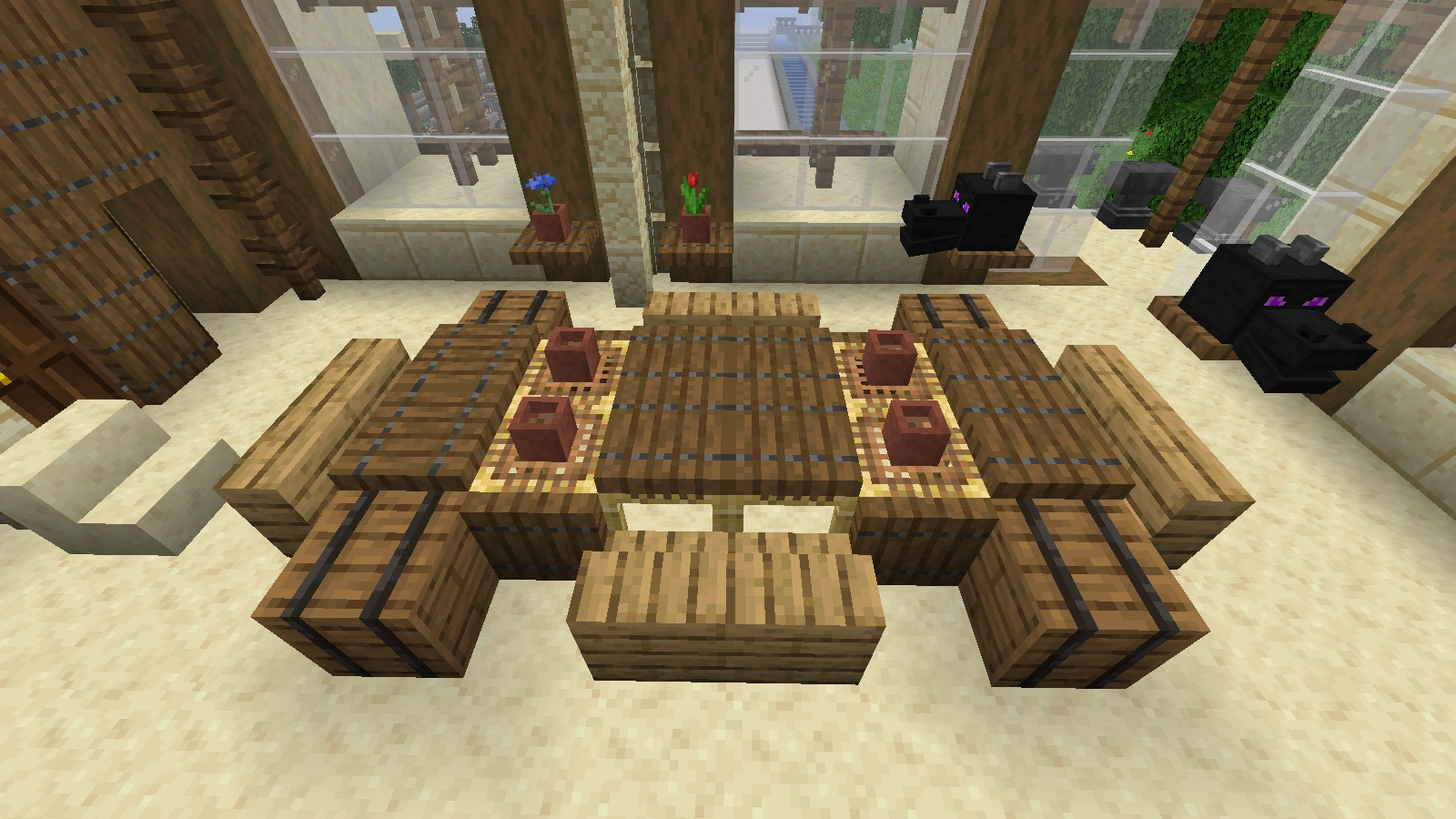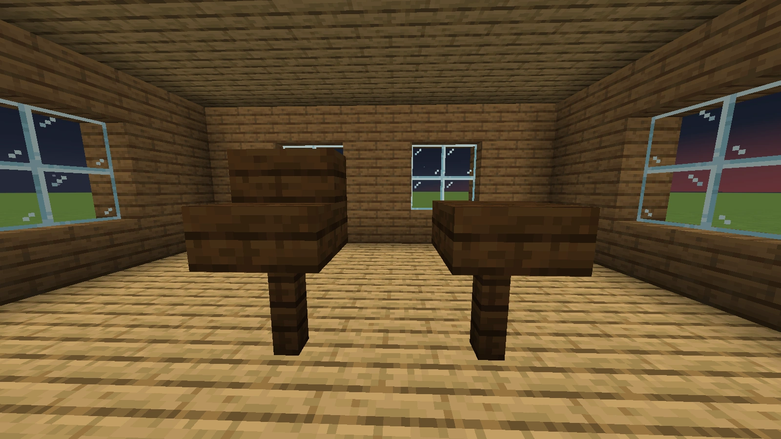 Bei diesen Arten von Tischen ist es ebenfalls möglich, fast jede Art von Tischbein zu verwenden. Eine Tischplatte aus Falltüren sieht dekorativ aus, aber sie hat im normalen Ressourcenpaket Löcher. Ein Tisch mit einer Stufe als Tischplatte ist 1,5 Blöcke hoch. Er eignet sich mehr als Bartisch, ist aber dennoch dekorativ. Allerdings lässt er sich, sofern man einen ganzen Block als Bein verwendet hat und die Stufen an die obere Hälfte dieses Blocks gesetzt hat, dekorieren.