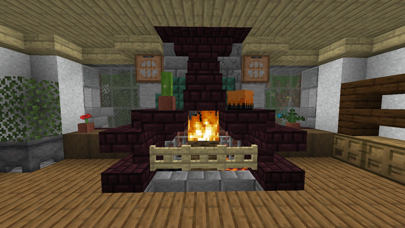 Eine einfache Feuerstelle macht sich in einer Höhle oder einer einfachen Hütte sehr gut. In einem Loch im Boden wird auf Netherrack ein Feuer entzündet und von zwei Seiten von Bruchsteinstufen umgeben. Links und rechts vom Feuer werden nun Mauern platziert. Danach setzt man auf diese jeweils einen beliebigen Zaun. Zwischen diese beiden Zäune wird nun wahlweise ein gefüllter Kessel oder ein Block Netherquarzerz gesetzt. Nun hat man entweder einen kochenden Eintopf oder bratendes Fleisch. Natürlich ist auch pinke Wolle möglich, wenn ein Schwein dargestellt werden soll.