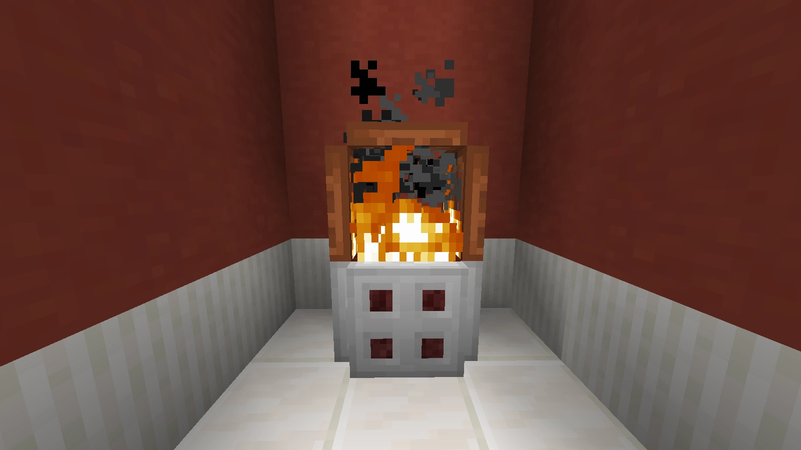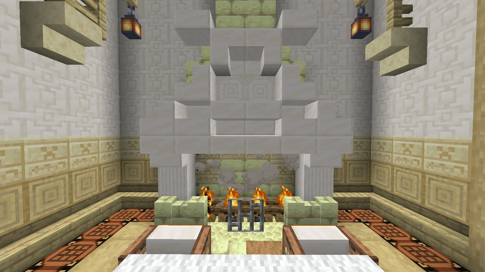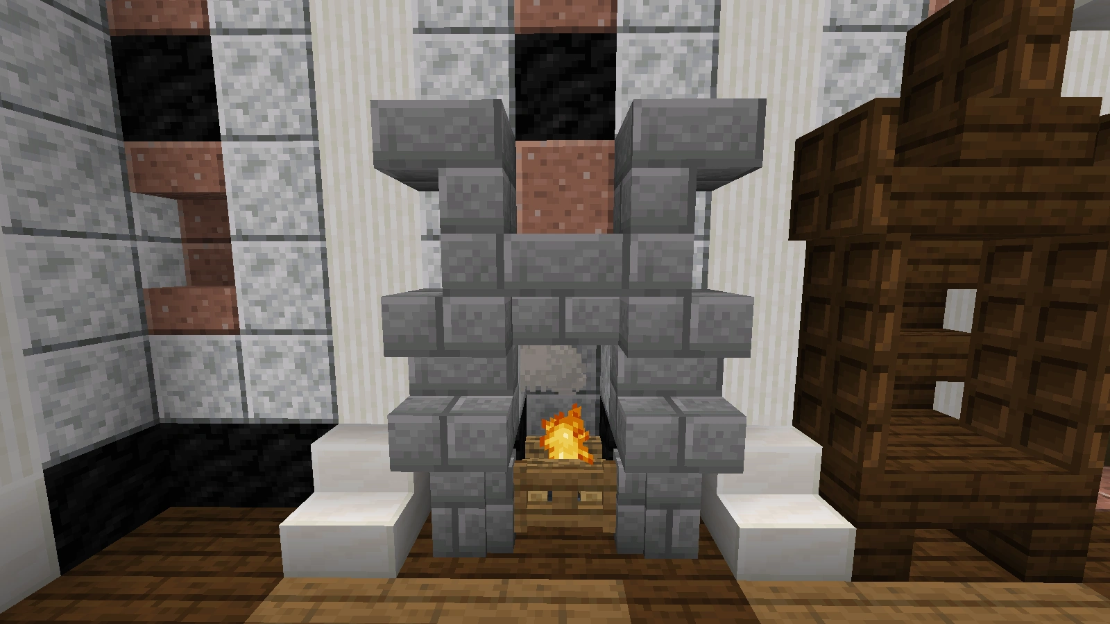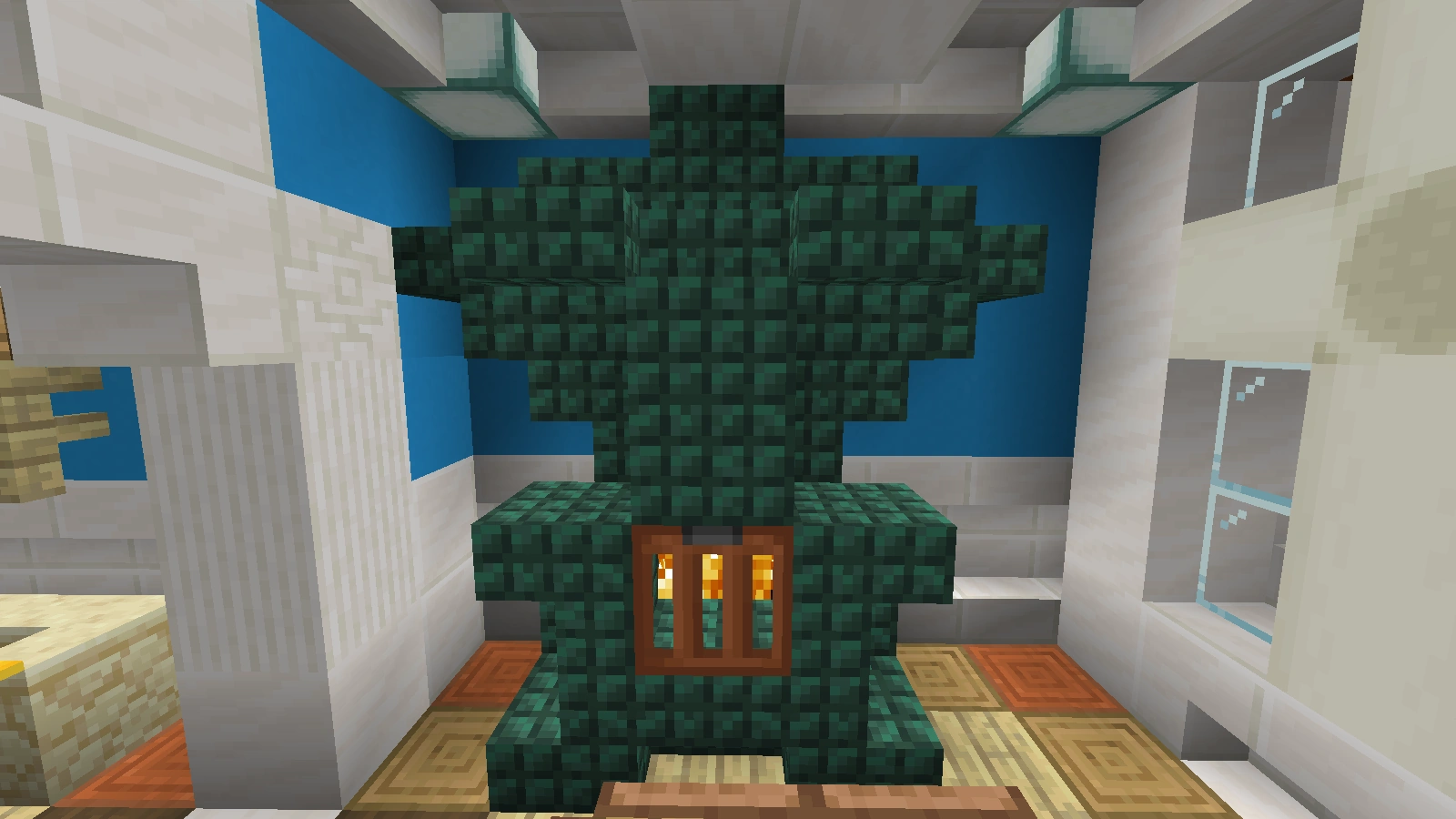 Bei diesem Kamin verwendet man Quarz und Netherziegel sowie andere zum Gebäude passende Blöcke und er wird eher rundlich gebaut. Auch auf Feuer kann man hier verzichten und stattdessen eine Redstonelampe nehmen. Der Abzug kann aus Eisenblöcken bestehen. Das Eisengitter wird hier durch bunte Glasscheiben ersetzt.