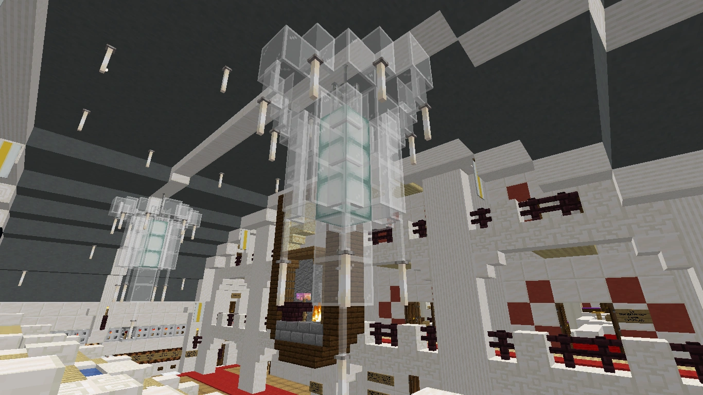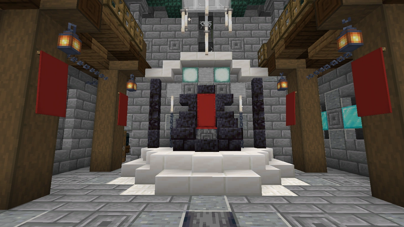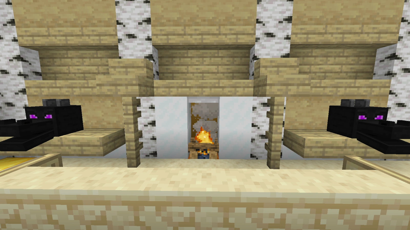 Bei diesem Kamin verwendet man Quarz und Netherziegel sowie andere zum Gebäude passende Blöcke und er wird eher rundlich gebaut. Auch auf Feuer kann man hier verzichten und stattdessen eine Redstonelampe nehmen. Der Abzug kann aus Eisenblöcken bestehen. Das Eisengitter wird hier durch bunte Glasscheiben ersetzt.