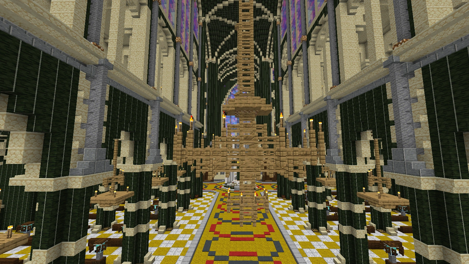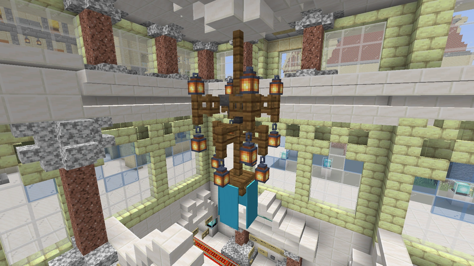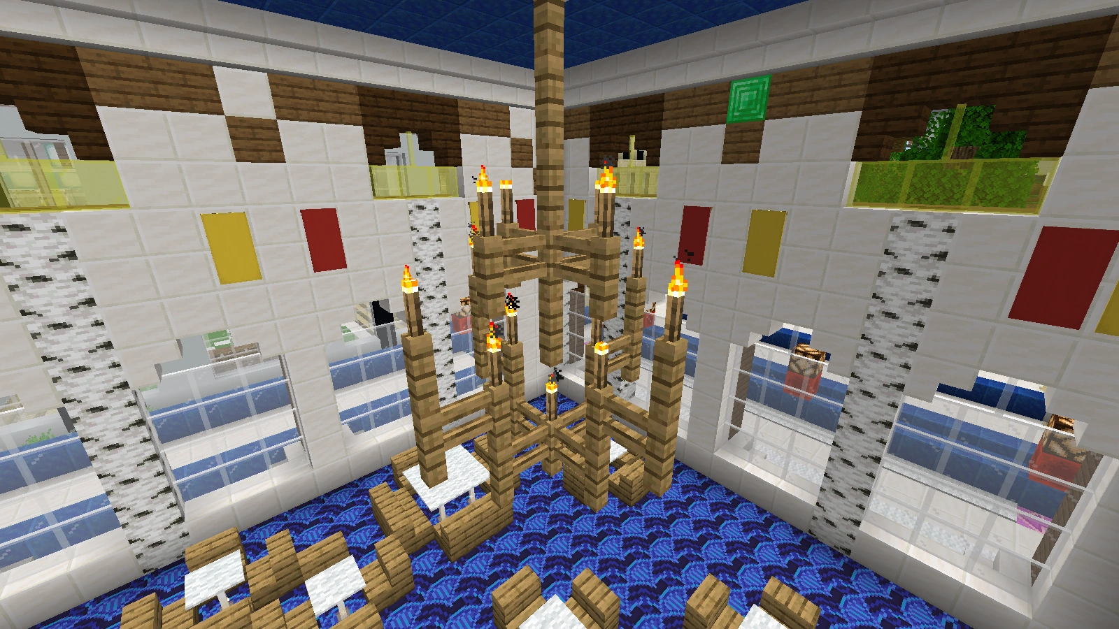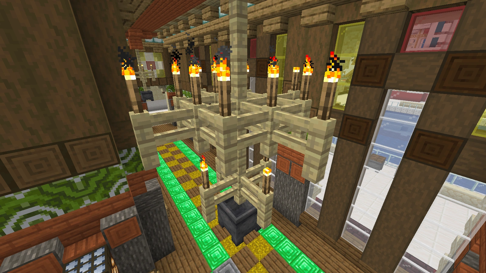 Bei diesem Kamin verwendet man Quarz und Netherziegel sowie andere zum Gebäude passende Blöcke und er wird eher rundlich gebaut. Auch auf Feuer kann man hier verzichten und stattdessen eine Redstonelampe nehmen. Der Abzug kann aus Eisenblöcken bestehen. Das Eisengitter wird hier durch bunte Glasscheiben ersetzt.
