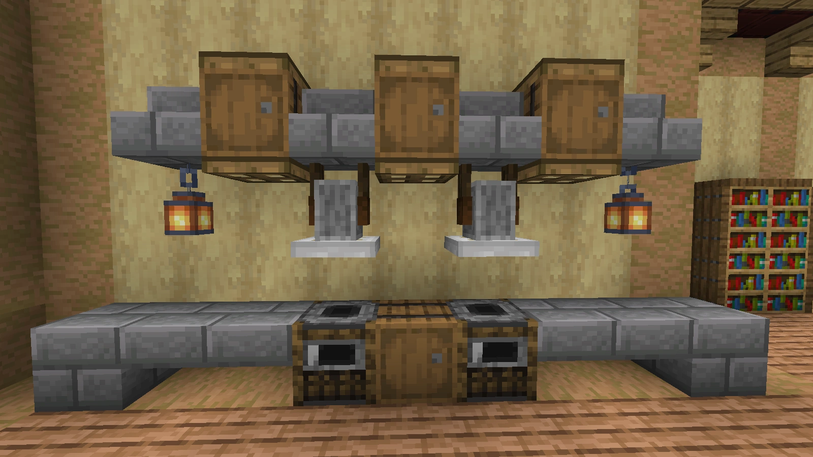 Diese Ofenzeile besteht aus mehreren aneinandergereihten Öfen. Dabei ist es auch möglich, Kochplatten und Töpfe zu simulieren. Kochplatten stellt man durch Eisenwägeplatten oder Steindruckplatten dar, Töpfe durch einfache Blumentöpfe. Der Abzug befindet sich meist 1,5 Blöcke über der Zeile. Er besteht oft aus Stufen oder Treppen einer Steinvariante, oft Steinziegel. In der Mitte führt eine Säule den Rauch ab. Diesen Abzug kann man mit einem Schornstein verbinden.