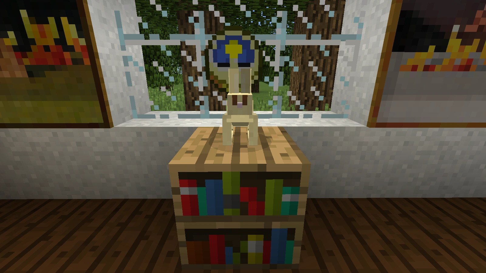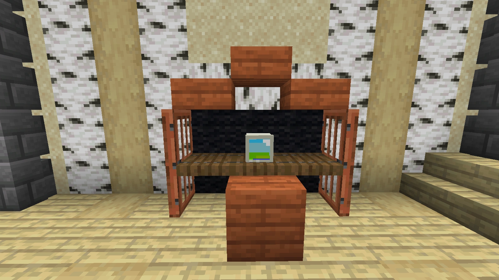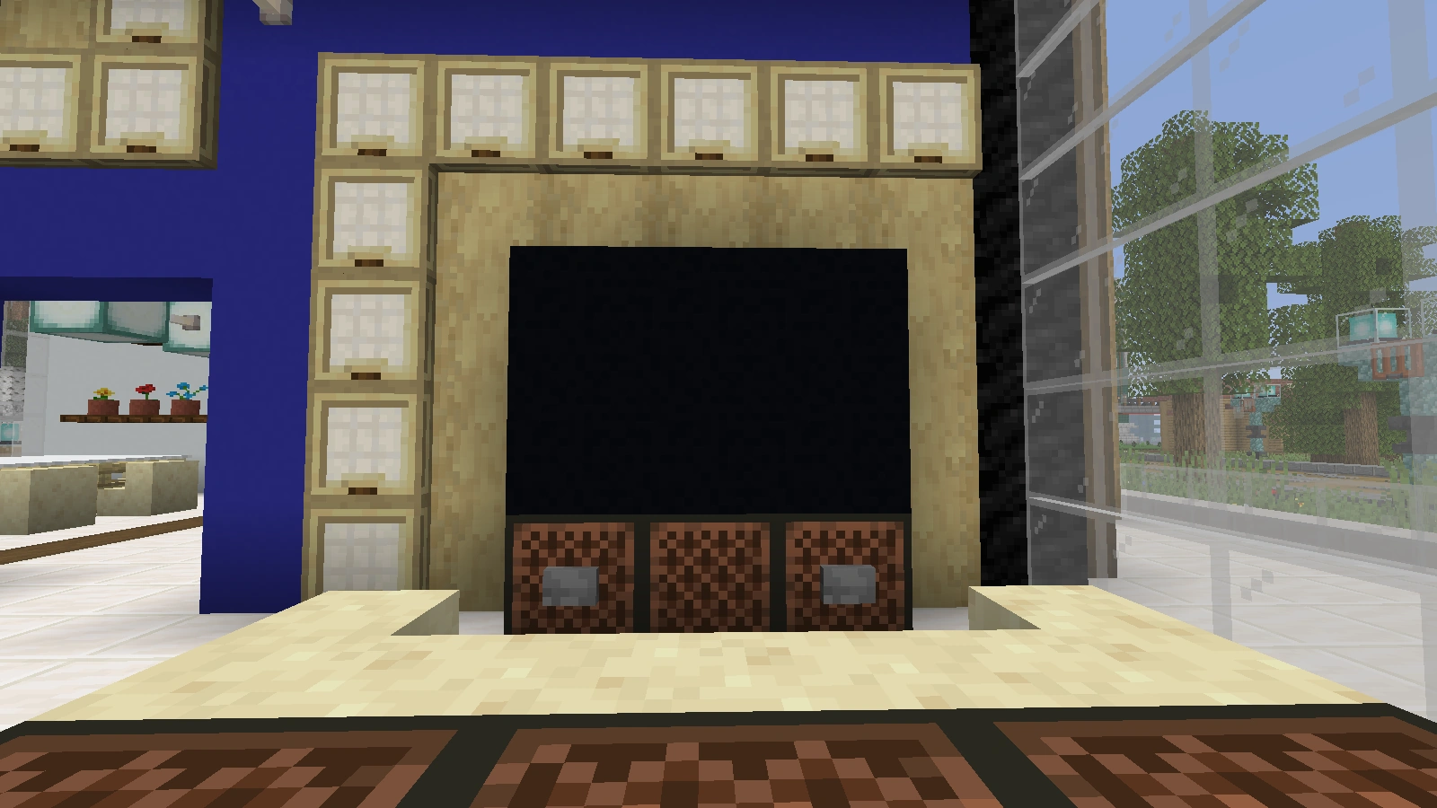 Dieses Design ist besonders flach und besitzt ein Motiv. Es kann jedoch sehr zeitaufwendig sein auf das richtige Bild zu warten. Um diesen Prozess zu beschleunigen, ist es möglich zuerst den Rahmen zu bauen. Dazu baut man eine kleine Ablage unter den zukünftigen Fernseher. Diese sollte etwa vier Blöcke lang sein. Als nächstes werden links und rechts davon wieder Lautsprecher aus Notenblöcken hinzugefügt. Auch eine Abdeckung im Abstand von zwei Blöcken in der Höhe von der Ablage sollte hinzugefügt werden. Nun kann das Bild hinzugefügt werden. Auch hier eignet sich ein Gemälde mit dem Format 4x2. Dieses Design ist mit dem normalen Flachbildschirm kombinierbar.
