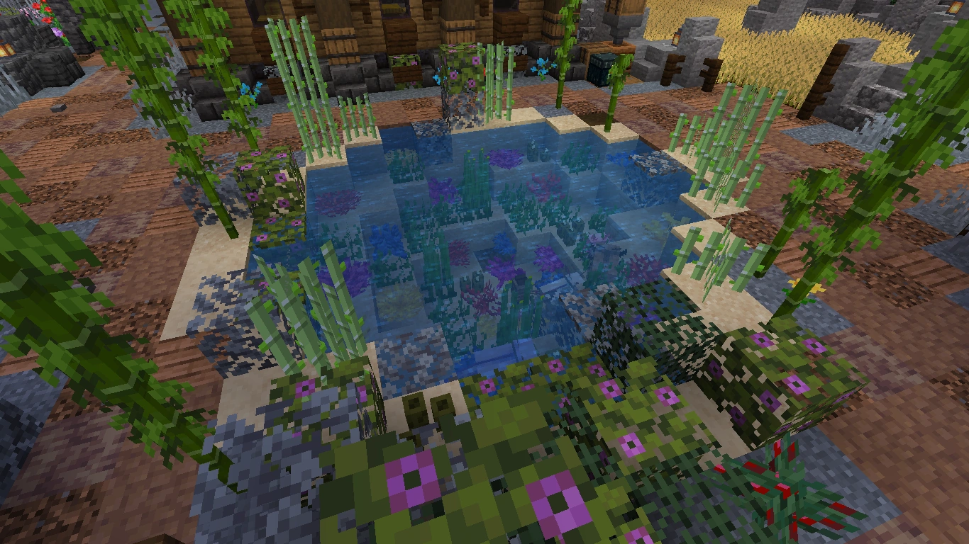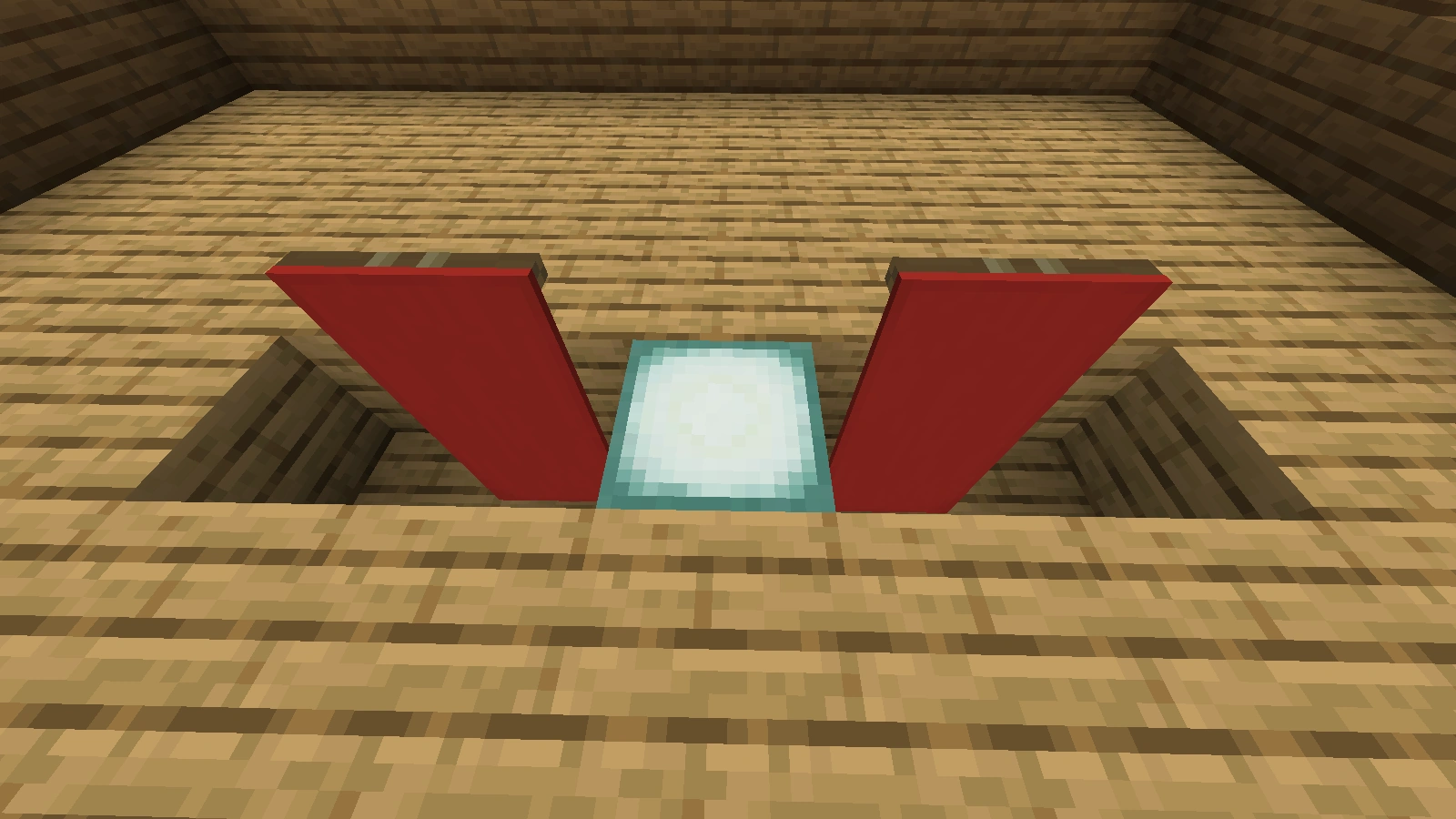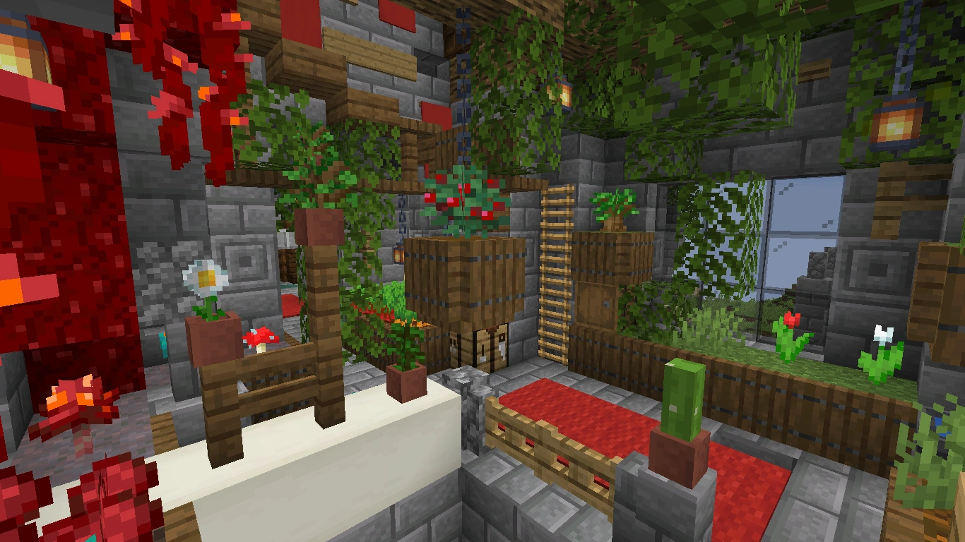 Wer größere Blumen möchte, kann auf diese Variante zurückgreifen. Dabei wählt man einen Grasblock, grobe Erde oder Podsol, in der Wüste ist auch Sand möglich, und platziert um diesen Block Holzfalltüren oder auch Eisenfalltüren, welche aber mit Redstone angesteuert werden müssen. Auf den Block kann man dann seine Blumen oder bei Sand einen toten Busch setzen. Auch Blätter sind möglich. Diese können auch auf einen Zaun gesetzt werden, was einen Zierbaum im Topf ergibt. Diese Methode eignet sich auch gut für die Außengestaltung.