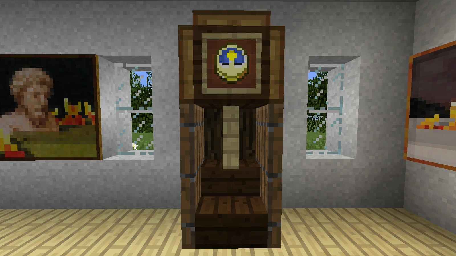 Eine Bodenstanduhr ist eine große - typischerweise an einer Wand - stehende Pendeluhr. Sie ist drei Blöcke hoch. Ein Treppenblock bildet den Unter- oder Bodenteil, darüber - in den Mittelteil - kommt ein Freiraum. Dahinter wird ein Block platziert, der die Hinterwand der Uhr darstellt (es sollte hierbei beachtet werden, dass der Block für die Hinterwand der Uhr möglicherweise aus der Zimmerwand herausschaut). Über den Mittelteil, also in den Oberteil, kommt der Block, auf dessen Vorderseite der Rahmen mit der eigentlichen Uhr platziert wird. Schließlich setzt man einen Zaun, eine Glasscheibe, ein Eisengitter oder einen Endstab (wenn einen die Partikel nicht stören) als Uhrenpendel in den Freiraum im Mittelteil ein. Als Ummantelung dienen für den Unter- bzw. Boden- und den Mittelteil Türen und für den Oberteil Falltüren.