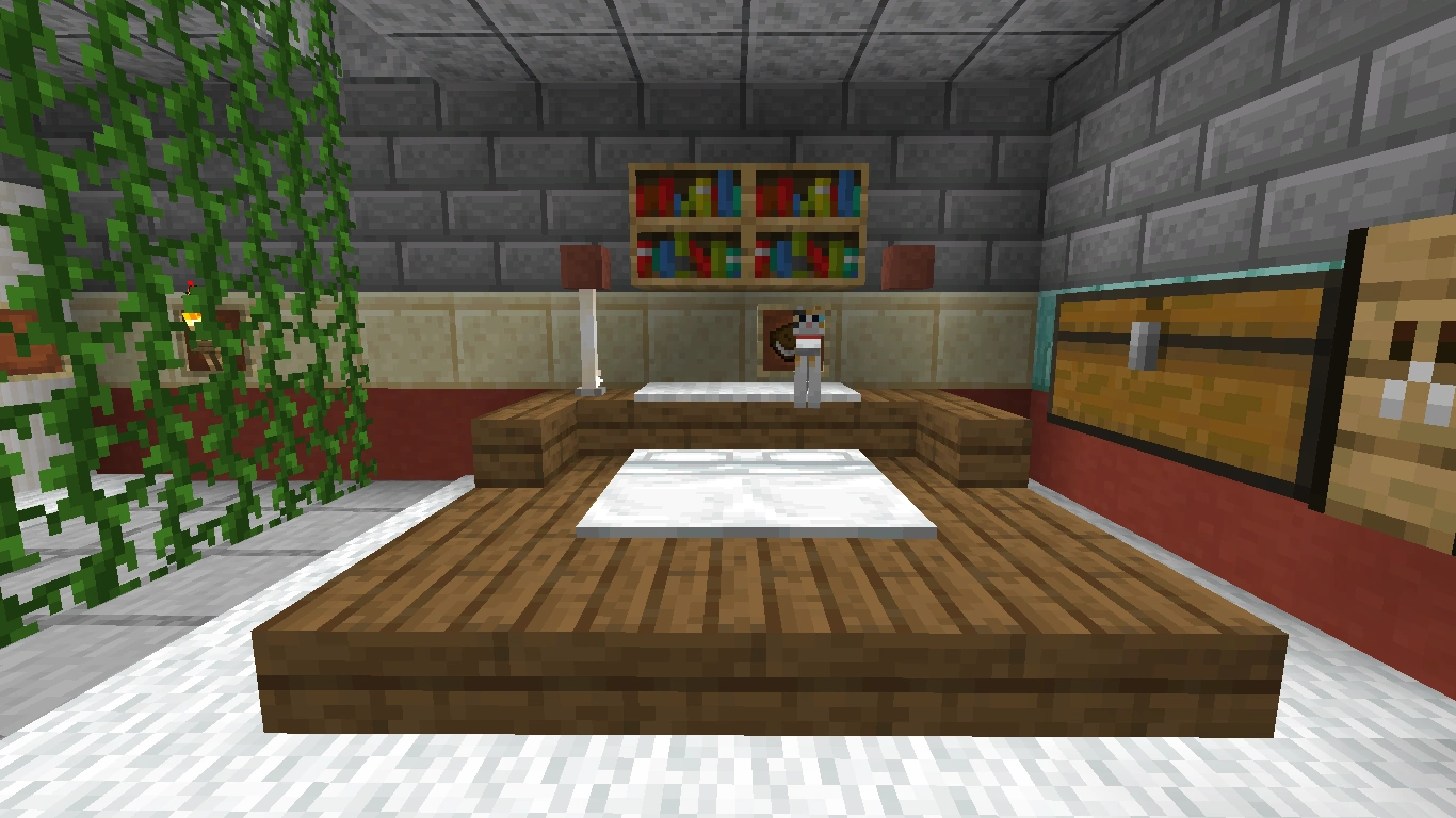 Man kann ein Sofa auch mit Betten bauen, wodurch man auf ihm schlafen kann. Dazu sollte man am besten weiße Betten nehmen. Andersfarbige sehen sonst merkwürdig aus, da sie einen Weißen streifen besitzen. Dies lässt sich jedoch auch über ein Ressourcenpaket ändern. (siehe Anleitung/Ressourcenpacket erstellen)