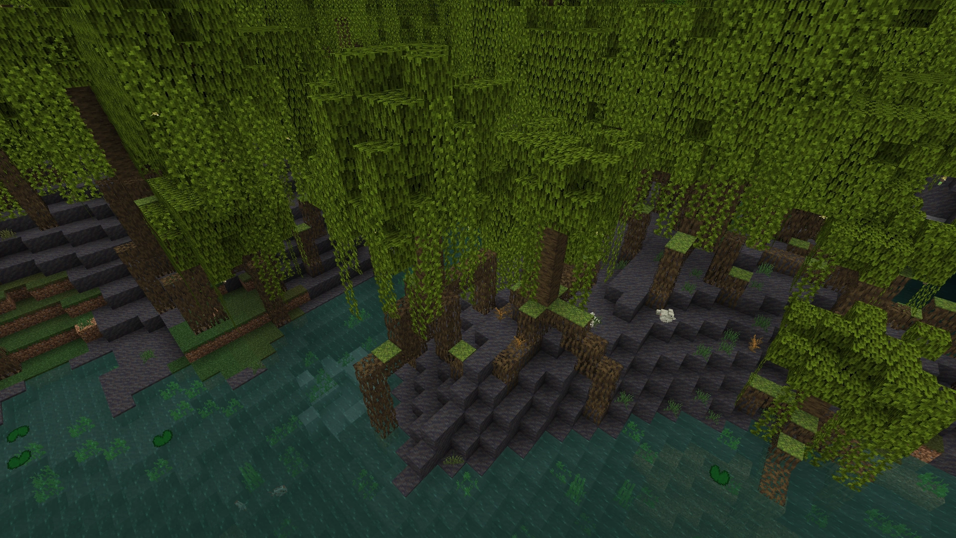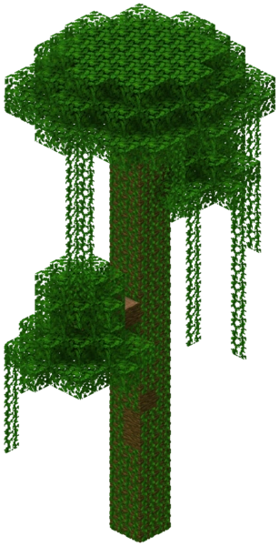 Riesig | Riesentropenbäume sind 2×2 Blöcke breit, können bis zu 32 Blöcke hoch wachsen und besitzen recht große Äste. Im Dschungeldickicht stehen sie mitunter sehr dicht beieinander und sind außerdem mit Ranken bewachsen. | Dschungel |