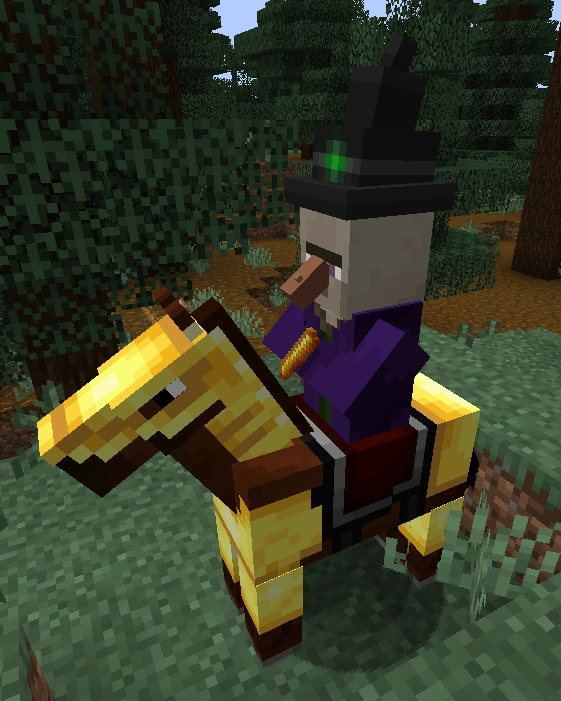 Der Befehl erzeugt ein Pferd mit NBT-Daten. Das Pferd muss zahm sein (Tame:1), sonst wirft es die Hexe gleich wieder ab. Es hat ein braunes Fell (Variant:3) und trägt eine Goldrüstung (id:golden_horse_armor). Reiter auf dem Pferd (Passengers) ist eine Hexe (id:witch), die eine Lohenrute (id:blaze_rod) in der Hand hält. Die HandItems-Eigenschaft enthält immer zwei Gegenstände. Wird nur der erste angegeben, wird der zweite als leer angenommen. |