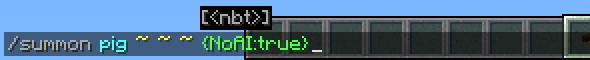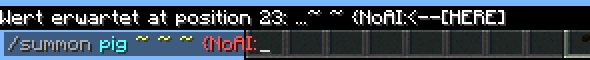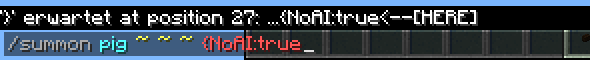 Die Eingabe {NoAI:true} ist Stringified NBT, d. h. NBT-Daten in Textform. Auch diese Eingabe wird von einer Unterfunktion abgearbeitet. Diese erkennt Leerzeichen, geschweifte und eckige Klammern, Doppelpunkte und Kommas als Trennzeichen und erwartet Eingaben mit den Bedeutungen "Eigenschaftsname" und "Eigenschaftswert". Die NBT-Eigenschaft mit dem Namen "NoAI" soll hier den Wert "true" haben. Der Parser prüft bei den NBT-Daten nur die Syntax, nicht die Semantik. Ob ein Eigenschaftsname richtig geschrieben oder der Wert gültig ist, wird vom Parser weder beim Eintippen, noch beim Abschicken der Eingabe geprüft. Vielmehr werden unbekannte NBT-Daten akzeptiert, aber vom Spiel einfach ignoriert.