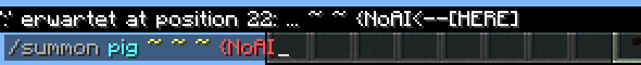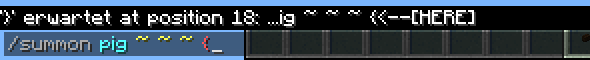 Als nächstes kann beim summon-Befehl eine Position folgen. Die Eingabe wird an eine Unterfunktion übergeben, die prüft, ob es drei Kommazahlen oder Tilde-Zeichen sind, die zusammen eine gültige Positionsangabe ergeben. Gibt man den Befehl /summon pig a 2 3 ein, meldet der Parser: "Kommazahl erwartet". Beim Erkennen des ersten Fehlers bricht der Parser ab und schaut sich die weiteren Eingaben gar nicht erst an.