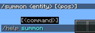 Der Befehl /help liefert jeweils den ersten Teil einer Befehlssyntax: /summon <entity> [<pos>]. Dies entspricht den ersten Knoten im Befehlsbaum zu diesem Befehl.