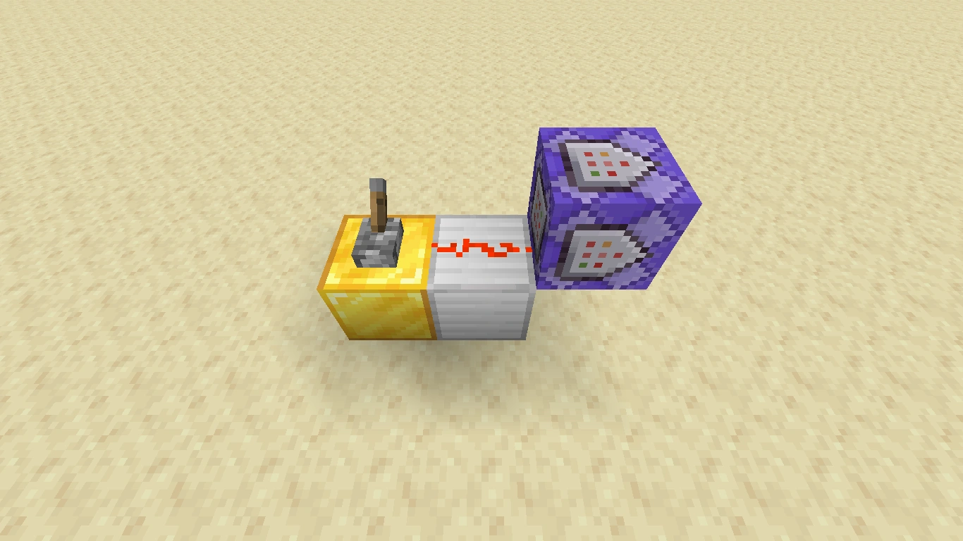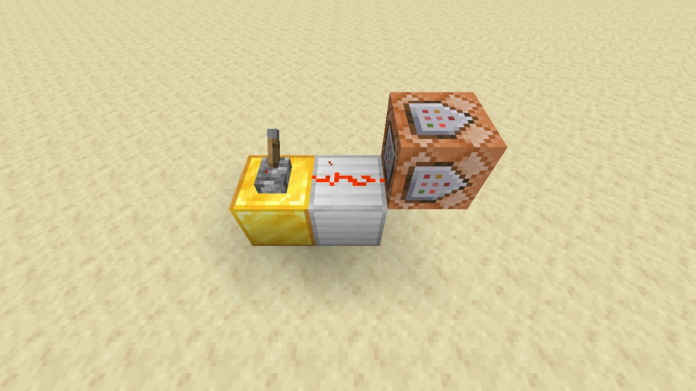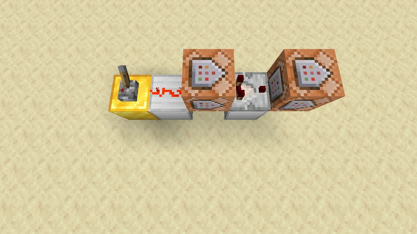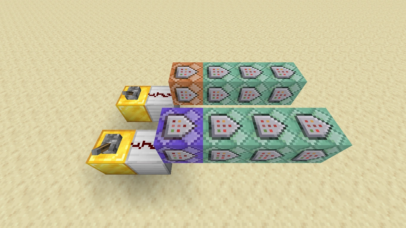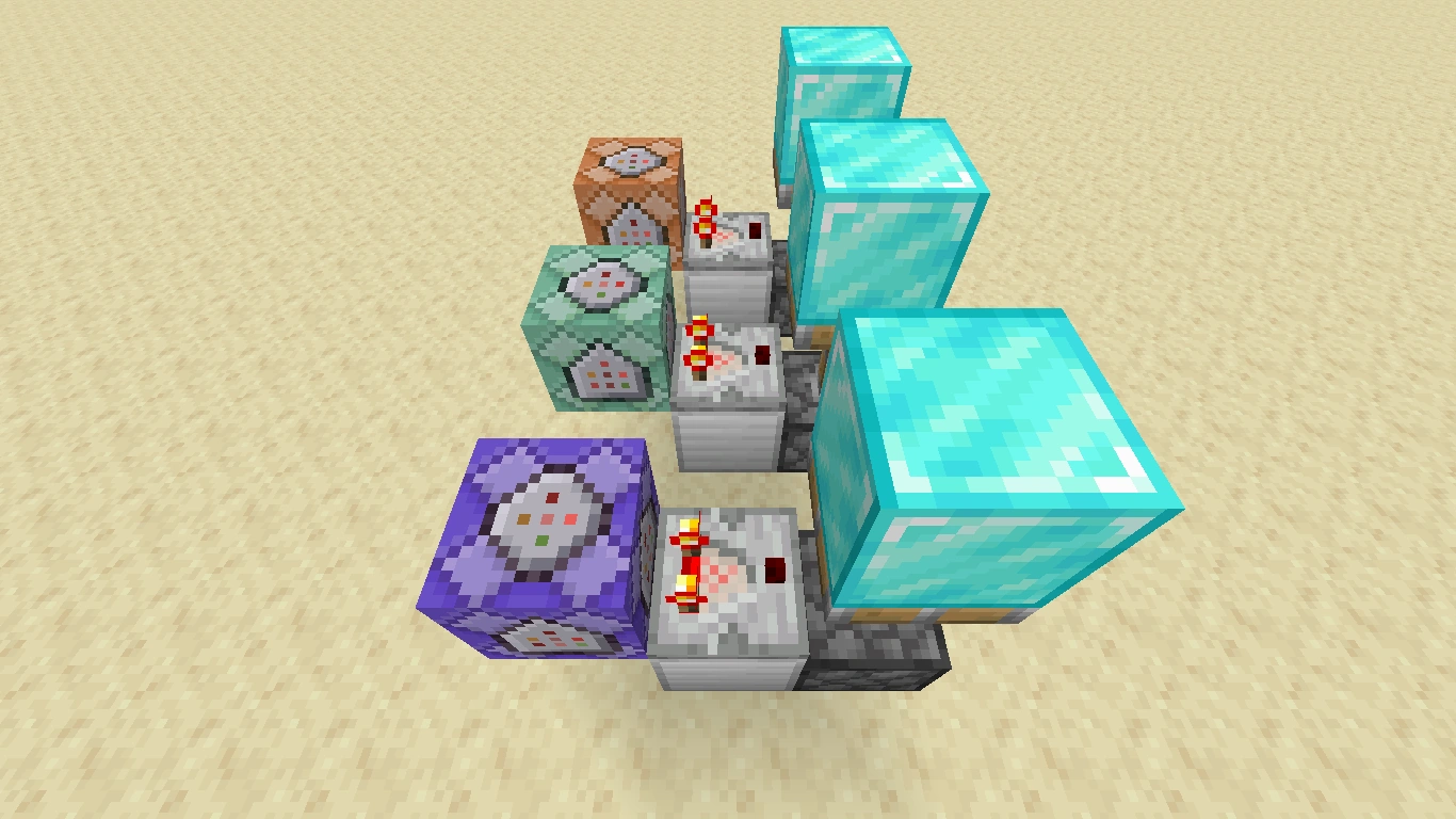 Wenn ein Komparator mit seinem Eingang (die Seite mit den zwei Fackeln) neben einem Befehlsblock platziert wird, sendet der Komparator ein Signal aus, sobald der Befehlsblock einen Befehl erfolgreich ausgeführt hat. Dieses Signal kann man verwenden, um einen Signalempfänger zu schalten. Die Signalstärke des Komparators ist von der Anzahl der vom Befehl betroffenen Spieler abhängig und muss daher ggf. mit einem direkt dahinter geschalteten Verstärker verstärkt werden.