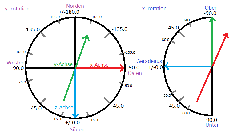 Der Blickwinkel wird in den Objektdaten als Rotation mit zwei Werten gespeichert. Der erste Wert beschreibt die Rotation des Objektes im Uhrzeigersinn um seine Y-Achse (0° = Blick nach Süden). Der zweite beschreibt die Neigung gegen den Horizont (0° = Blick geradeaus).
