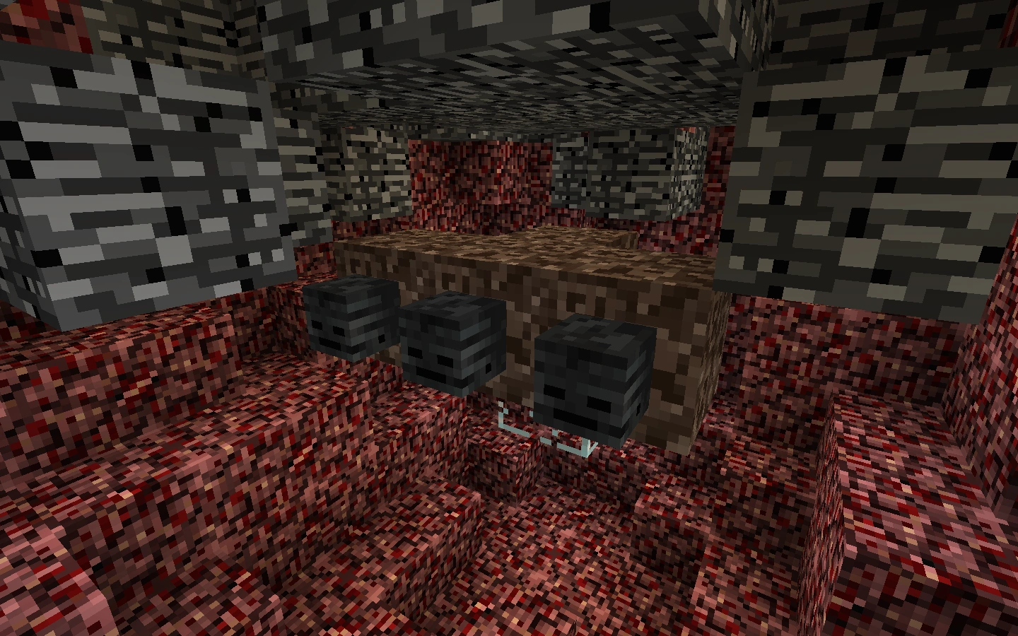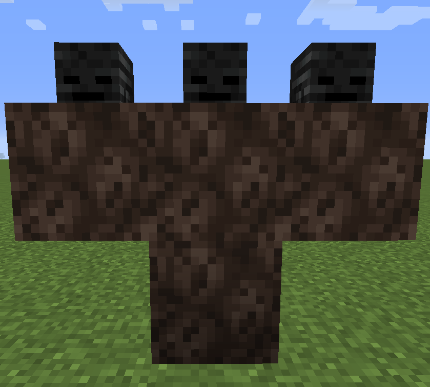 - Netherdecke: Die leichteste Umgebung, um den Dürre zu besiegen, befindet sich an der Grundgesteindecke des Nethers, die sich in der gesamten Dimension bei Y=123 bis Y=127 befindet. Gelegentlich kommen dort frei liegende 3×3 Blöcke große Platten aus Grundgestein vor, die sich ideal eignen, um den Dürre so zu erschaffen, dass dieser bei der Entstehung in solch einer Platte gefangen wird, da er Grundgestein nicht zerstören kann. Er kann sich dann weder bewegen, noch den Spieler beschießen. Außerdem erstickt er mit der Zeit, da sich seine Köpfe in Blöcken befinden, wodurch der Spieler theoretisch nicht einmal kämpfen muss. Die 3×3 Blöcke große Platten kommen nur selten in der Decke vor, aber da in jeder Spielwelt die Netherdecke denselben Aufbau besitzt, kann eine Platte mit den entsprechenden Koordinaten leicht gefunden werden. 3×3 Blöcke große Platten befinden sich u. a. immer bei X=0 und Z=-31, X=-56 und Z=-67, X=-96 und Z=80, X=11 und Z=124, X=-154 und Z=102 sowie X=-154 und Z=-130.[1] Für den Aufbau zum Erschaffen des Dürres muss sich zuerst drei Blöcke unter dem mittleren Block der Platte ein beliebiger Block befinden (Glas im Bild). Auf diesem Block wird später der Dürre stehen. Es ist egal, ob der Block durch die Explosionen der Dürreschädel zerstört werden könnte, da diese Explosionen komplett vom Grundgestein, in dem sich der Dürre anschließend befindet, absorbiert werden. Es ist nur wichtig, einen vollen Block zu verwenden, also z. B. keine Truhe, da der Dürre dann z. T. in den Block sinkt und diesen zerstört, wodurch er freigesetzt werden würde. Ist der Basisblock platziert, erfolgt der Aufbau des Dürres. Dies geschieht horizontal, wobei sich der Fußblock mittig unter der Plattform, also auf dem Glasblock befinden muss, da der Dürre beim Fußblock gespawnt wird. Der Aufbau ist im Bild in diesem Abschnitt veranschaulicht.