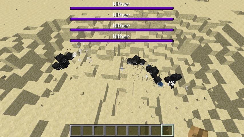 - Oberirdisch: Ein oberirdischer Bosskampf ist sehr schwierig und daher nur sehr erfahrenen Spielern zu empfehlen. Der Dürre kann nämlich leicht in die Höhe aufsteigen und bleibt dann in einer gewissen Höhe über dem Spieler schweben und beschießt diesen mit seinen Dürreköpfen. Auf diese Weise erhält der Spieler viel Schaden, und kann den Dürre nur mit einem Bogen erreichen. Im schlimmsten Fall kann man sogar den Überblick verlieren, wo sich der Dürre befindet, so dass er über lange Zeit außer Kontrolle durch die Welt fliegen und verschiedene Tiere angreifen kann. Wichtig ist, dass man den Dürre nicht in der Nähe von wichtigen Bauwerken erschafft, da er sie sonst teilweise sprengen könnte. Dünne Wände sind niemals empfehlenswert, selbst wenn sie aus Obsidian sind, da die blauen Dürreschädel auch diesen zerstören können. Außerdem ist die anfängliche Explosion eines Dürres sehr stark, so dass er sich gleich zu Beginn aus engen Gefängnissen befreien kann.