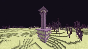 Dieser Teil der äußeren Endinseln bietet alles, weswegen man den beschwerlichen Weg überhaupt auf sich nimmt. Das Biom bildet die höher gelegenen, flachen Inselmitten, wo überall kleine Wälder aus Choruspflanzen wachsen. Mit etwas Glück stößt man sogar auf eine seltene Endsiedlung, wo sich einige einzigartige Schätze finden lassen. Während auf den schwebenden Inseln selbst wieder überall nur Endermen auftauchen, gibt es im Inneren der Endsiedlungen etwas Abwechslung, nämlich Shulker. Ansonsten trifft man auf der Inseln höchstens noch auf ein einzelnes Endtransitportal. |