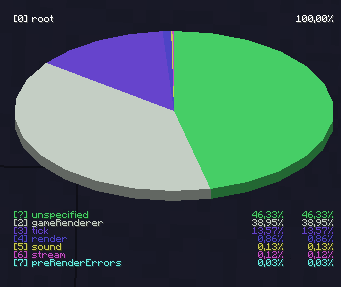 Es kann manchmal vorkommen, dass sich bei geöffnetem Profiler die fps-Zahl merklich verringert. Dies liegt an der recht anspruchsvollen Darstellung und den sich schnell verändernden Inhalten des Tortendiagramms. Abhilfe schafft es entweder, das restliche Spiel zu ignorieren oder das Tortendiagramm zu schließen.